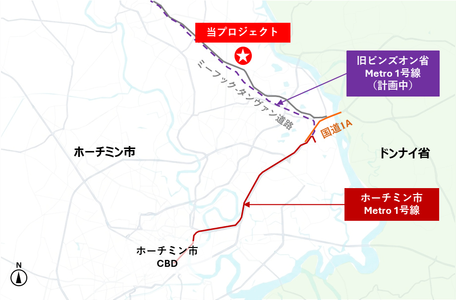 当プロジェクトは、ホーチミン市の中心業務地区(CBD)から約20kmに位置するホーチミン市タンドンヒエップ坊において開発される分譲マンション(コンドミニアム)開発案件です。周辺エリアでは交通インフラの整備が進展しており、ホーチミン市の中心業務地区(CBD)への通勤利便性の向上を背景に、中間所得層を中心とした住宅需要が堅調なエリアに位置しています。