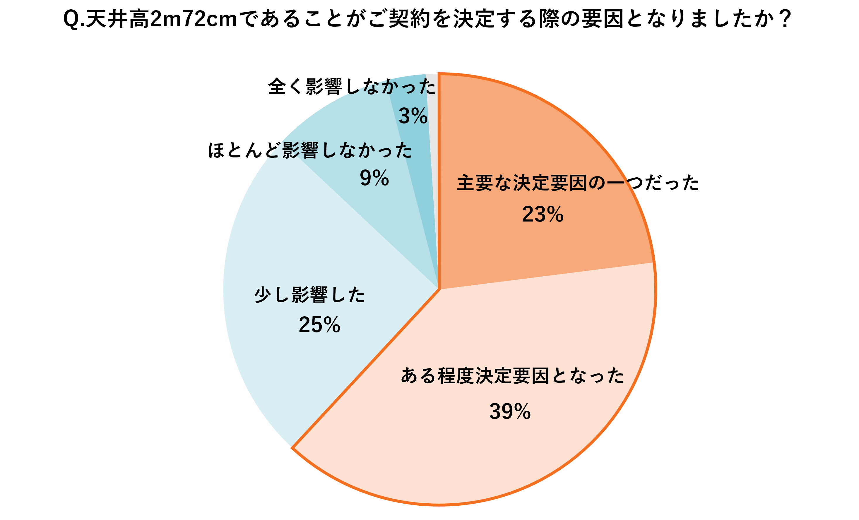 こうした「開放感」と「快適性」の両立は、住まいを検討される多くの方にとって、大切な判断基準となっているようです。今回のアンケートで、「天井高2m72cmであることが、ご契約を決定する際の要因となりましたか?」と伺ったところ、全体の約6割以上ものオーナーさまが「決め手になった」と回答されました。