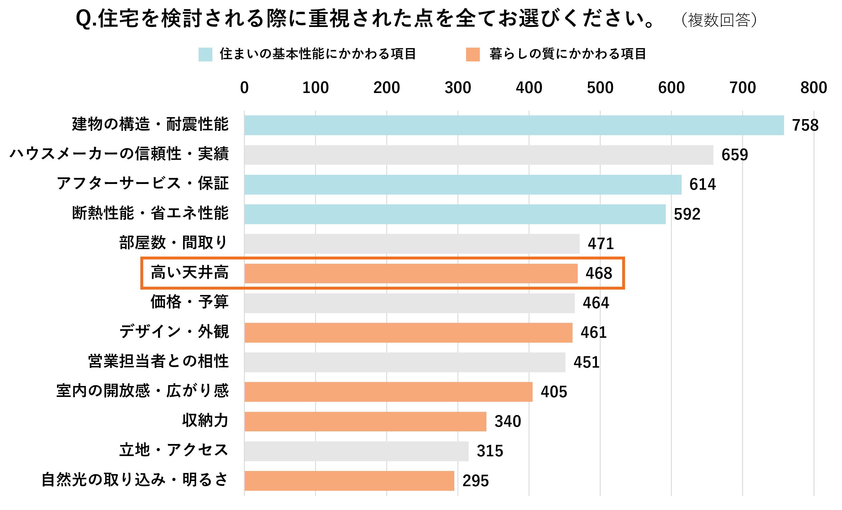アンケートの結果、住宅を検討される際の重視項目では、「建物の構造・耐震性能」や「アフターサービス・保証」「断熱性能・省エネ性能」といった住まいの基本性能に続いて、「高い天井」がランクインしています。