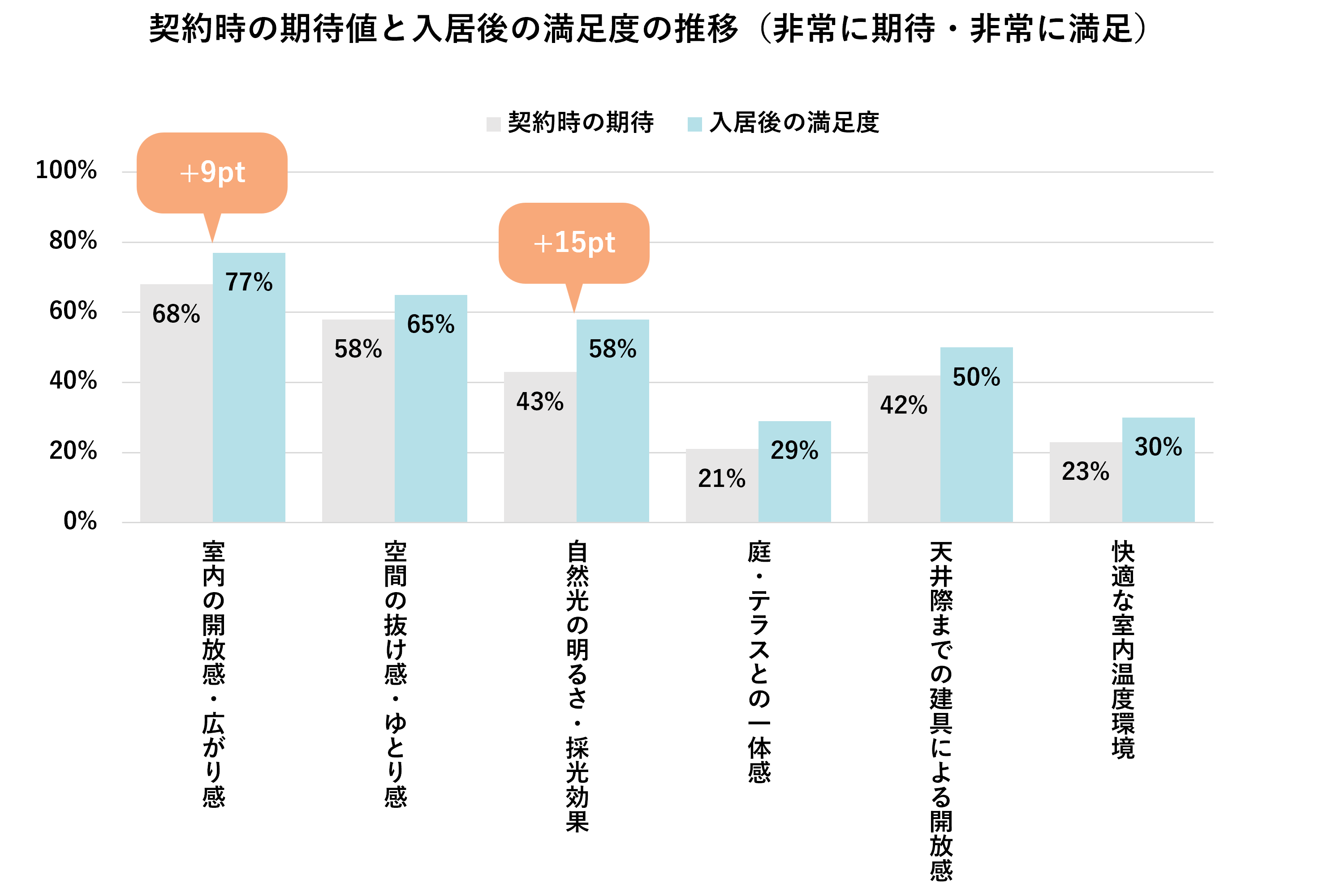 ✔ 入居後の満足度は期待を大きく上回り、「明るさ」や「広がり感」など複数項目でポジティブ
