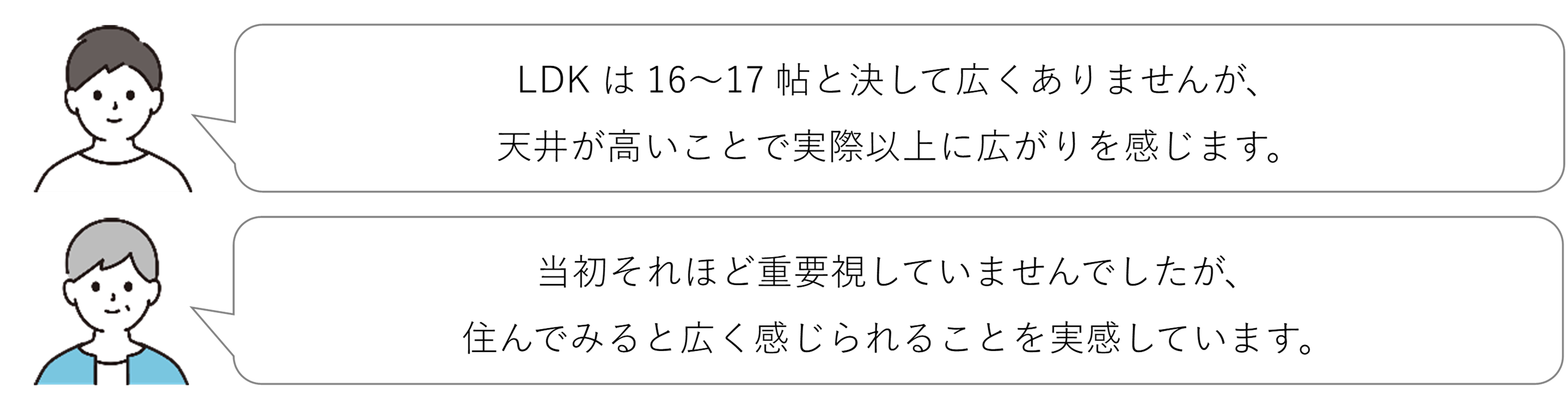 ✔ 天井が高いことで空調効率を不安視する声がある一方、断熱性能により想定より快適に過ごせ