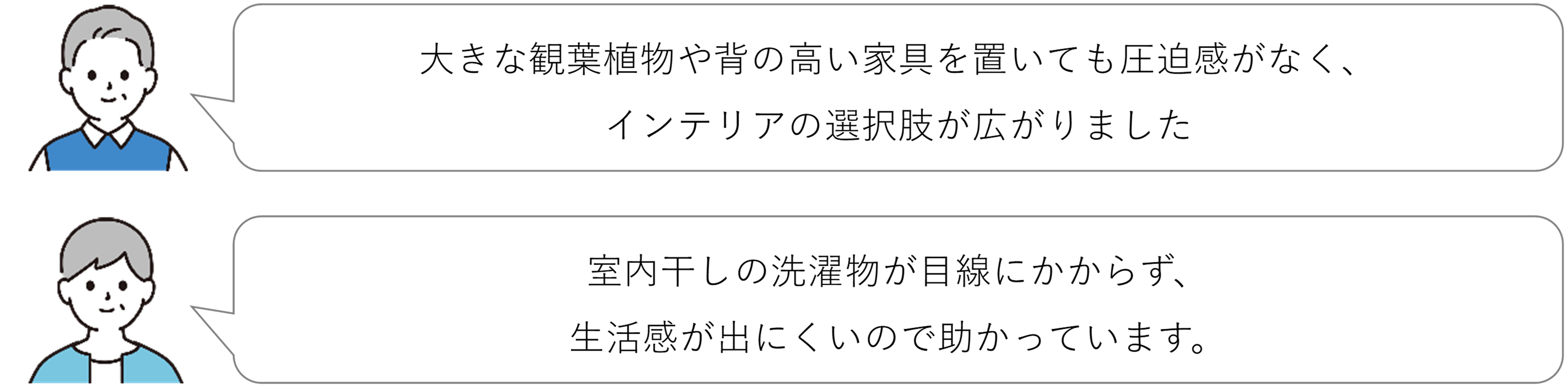 自由回答からは、空間が広く感じるという視覚的なメリットだけでなく、日々の過ごし方や気持ちの変化が見えてきました。実際に寄せられたオーナーさまの声をご紹介します。