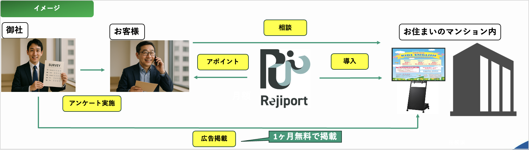 マンション居住者向け掲示板アプリ「Rejiport(レジポート)」は、エントランス内に設置された電子掲示板を活用し、居住者へ直接情報発信できる新しい広告掲載サービスの提供を開始しました。