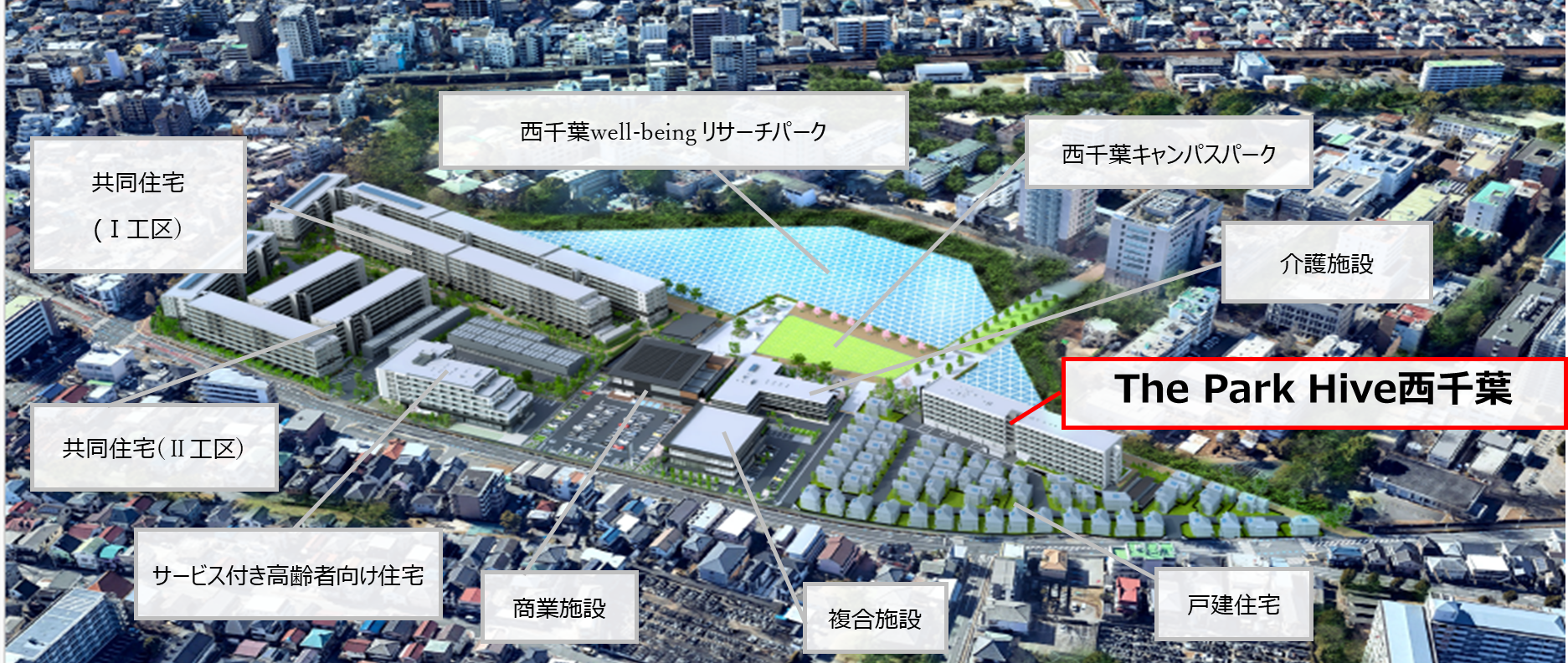東京大学西千葉キャンパス跡地はJR総武線「西千葉」駅から徒歩3分に位置し、周辺には千葉大学をはじめとする教育機関が集積する約75,000㎡の文教エリアです。その中で、大規模複合開発「千葉 学美の杜」は、併せて約 1,300 戸の共同住宅・学生マンション・サービス付き高齢者向け住宅を建築するほか、戸建住宅、商業施設、複合施設、介護施設などの整備が予定されています。敷地内には歩行者動線や約12,000㎡の広場空間「(仮称)西千葉キャンパスパーク」が設けられ、駅・大学・周辺住宅地との回遊性の高い街区構造を形成する計画です。