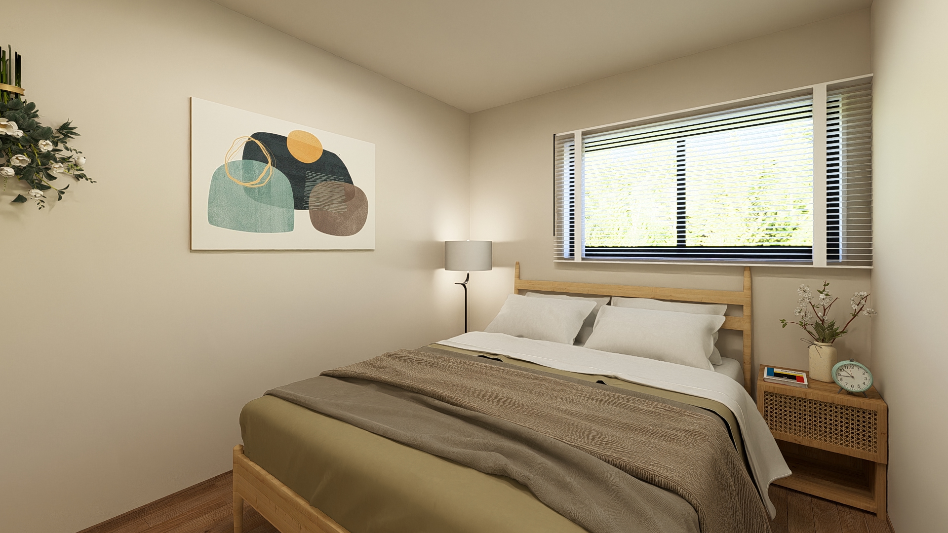 優しい色合いと素材感が心地よい寝室は、シンプルだからこそライフスタイルに合わせたコーディネートを楽しめます。