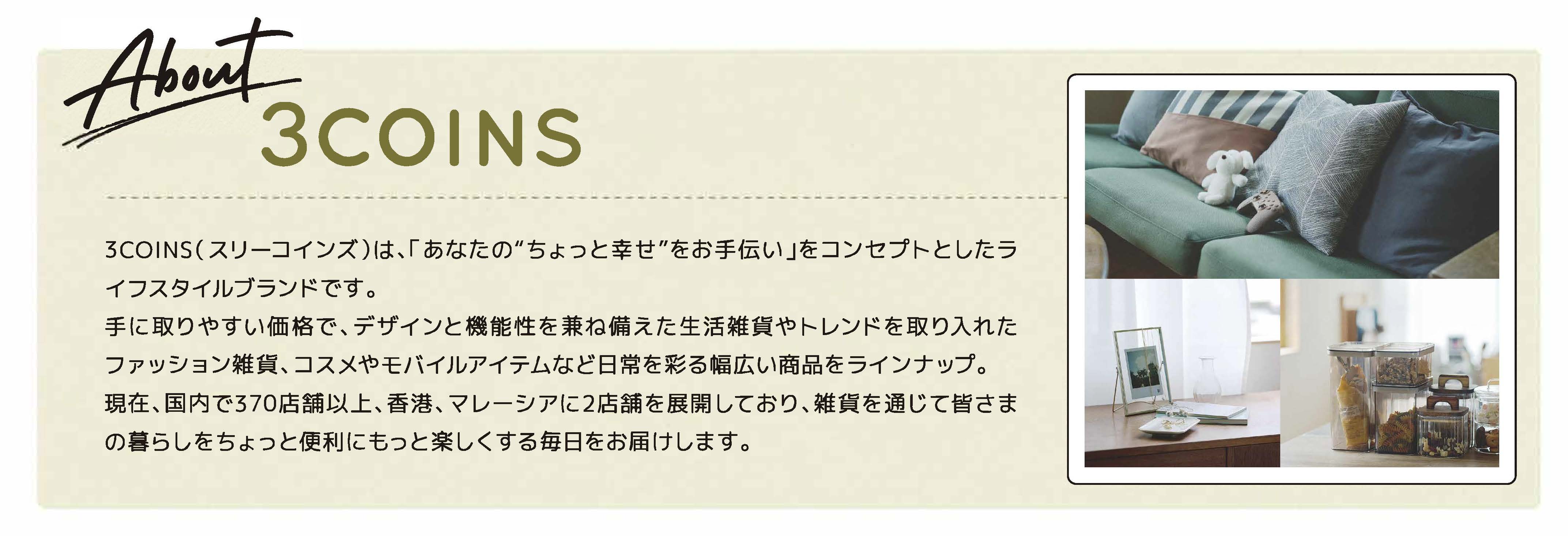 という3COINSのコンセプトを表現した言葉の頭文字からとったもの。
