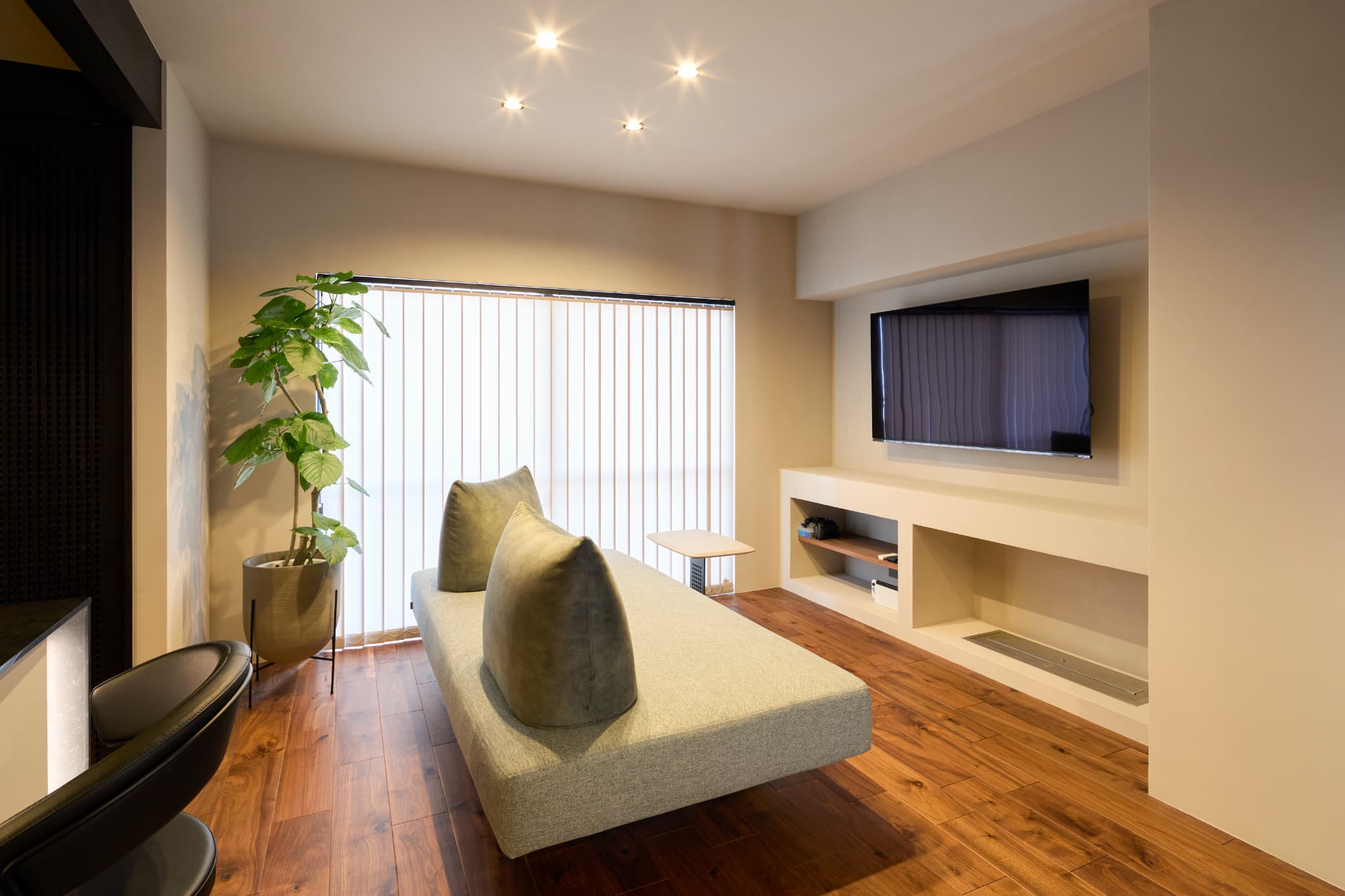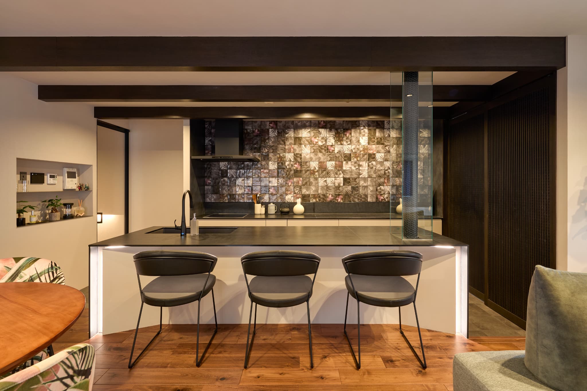 マンションでも取り入れやすい「エコスマートファイヤー」を導入。煙突工事が不要で、煙や灰も出ないため、住戸内でも安心して設置できます。設置には一定の施工条件はありますが、揺らぐ炎が住まいに非日常のくつろぎをもたらします。
