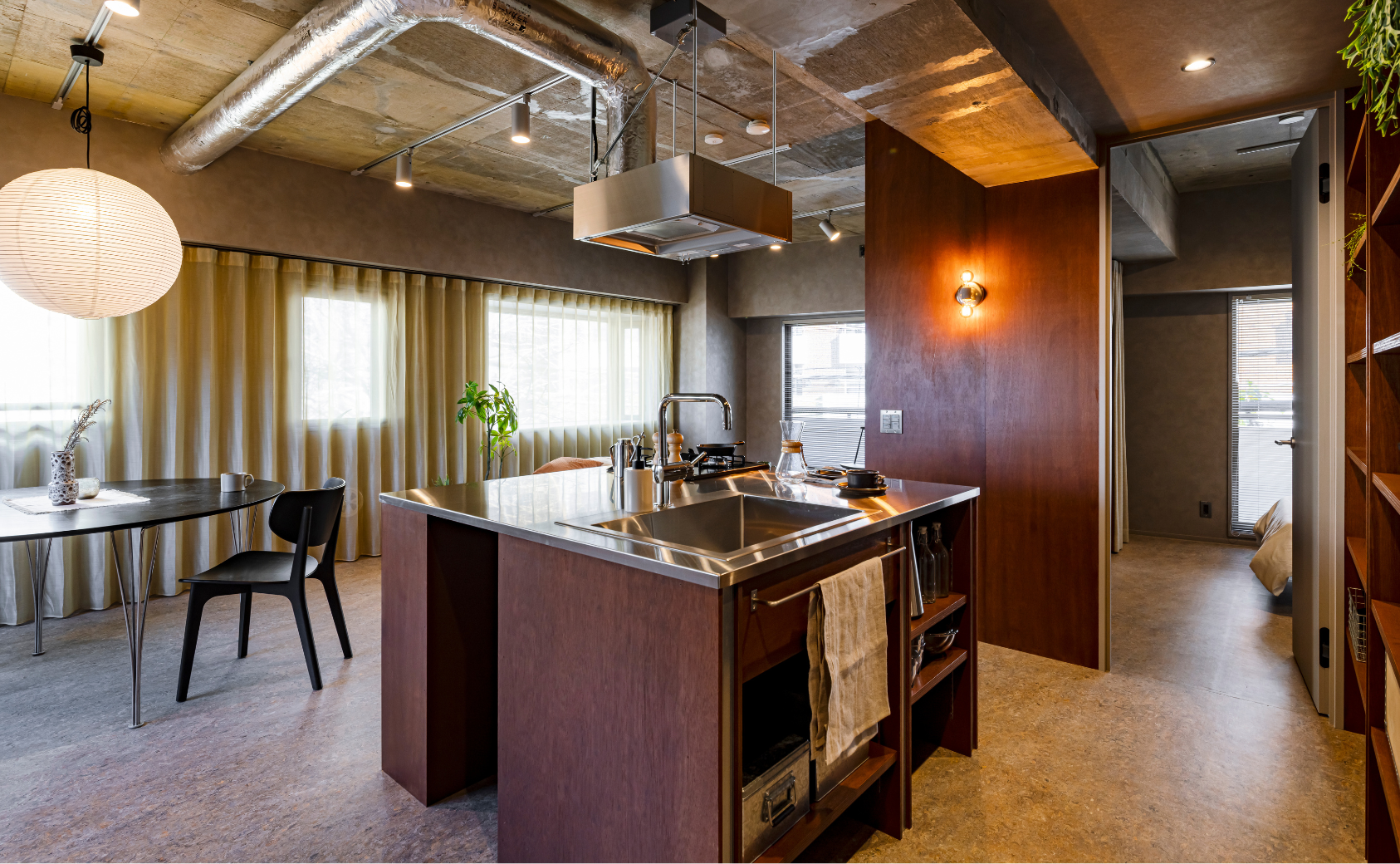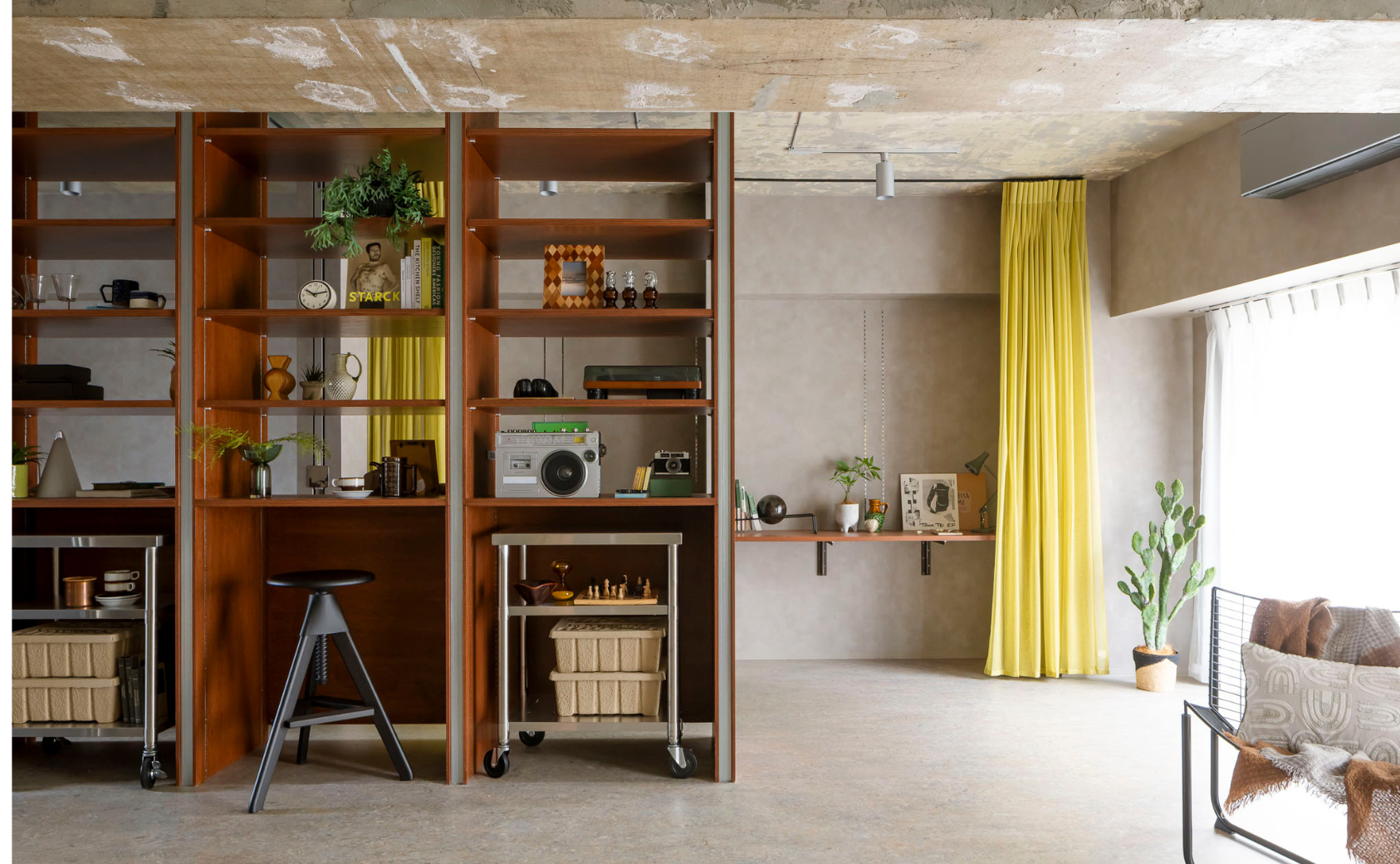 専有部では、空間をゆるやかに仕切る造作可動棚により、住まい手が趣味やこだわりにあわせてカスタマイズできる「余白」を確保しました。既存の天井材や壁紙の跡はあえて残し、建物の記憶と無骨な風合いを楽しめる内装デザインとなっております。エントランスには、コールテン鋼など経年変化を楽しめる素材を採用しています。