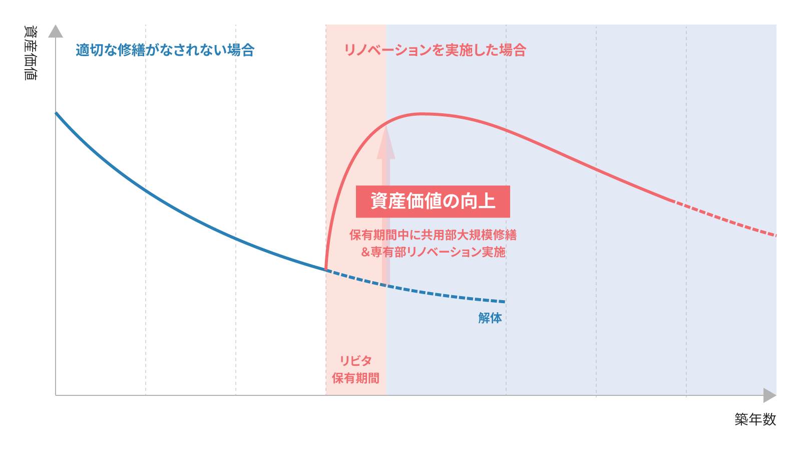 リビタが培ってきた一棟リノベーション事業の知見を活かし、長期的な視点での大規模修繕とバリューアップを実施します。分譲マンションに比べて寿命が短いとされる賃貸マンションにおいて建物の寿命を延ばし、環境負荷を低減しながら、持続可能な社会の実現に貢献します。