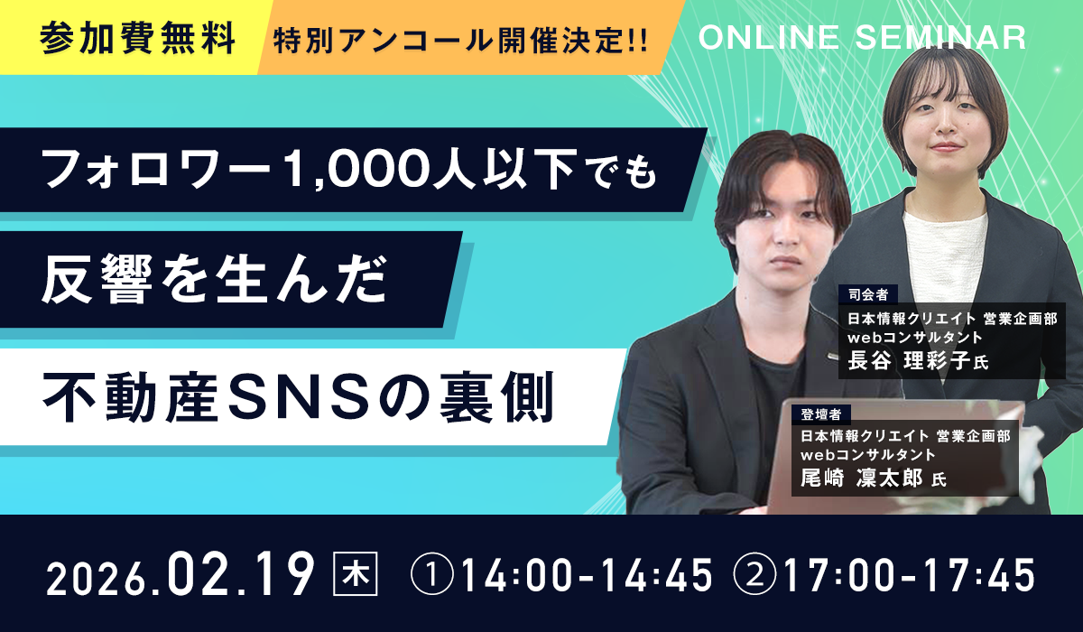 不動産テックを推進する日本情報クリエイト株式会社(本社:宮崎県都城市、代表取締役社長:辻村 都雄、証券コード:4054)は、2026年2月19日(木)に、不動産会社様向け無料オンラインセミナー『フォロワー1,000人以下でも反響を⽣んだ 不動産SNSの裏側』をアンコール開催いたします。