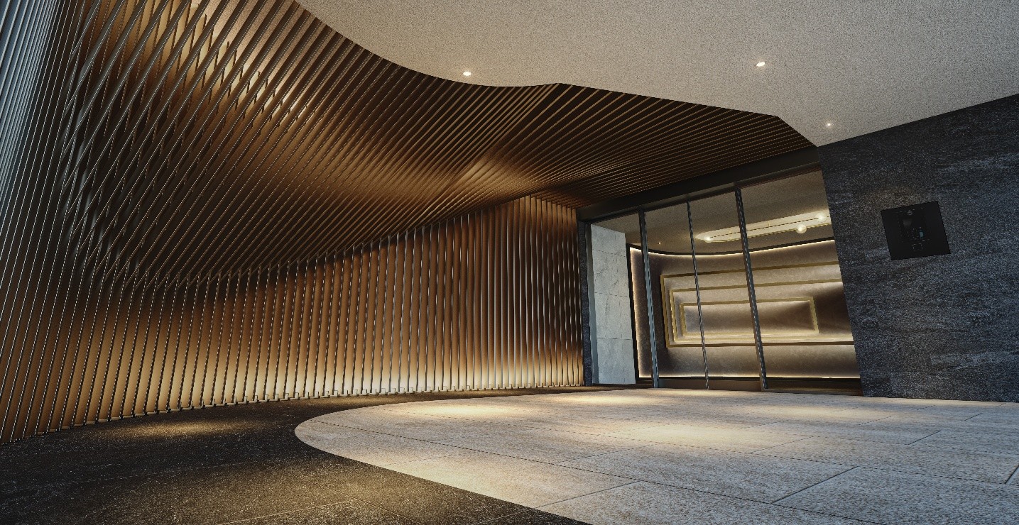 全住戸を角住戸とする計画により、採光・通風・独立性に優れた快適な住空間を実現しました。また、外観のデザインは、目黒通りに面した象徴的なエントランスを核に構成。メタルルーバーが立体的に交差する曲線デザインが、通行者の視線を惹きつける大胆かつ優雅なアプローチを演出。さらに、建物内すべての蛇口から出る水にはウルトラファインバブル発生機を導入し、洗浄効果や節水効果の向上を図っています。