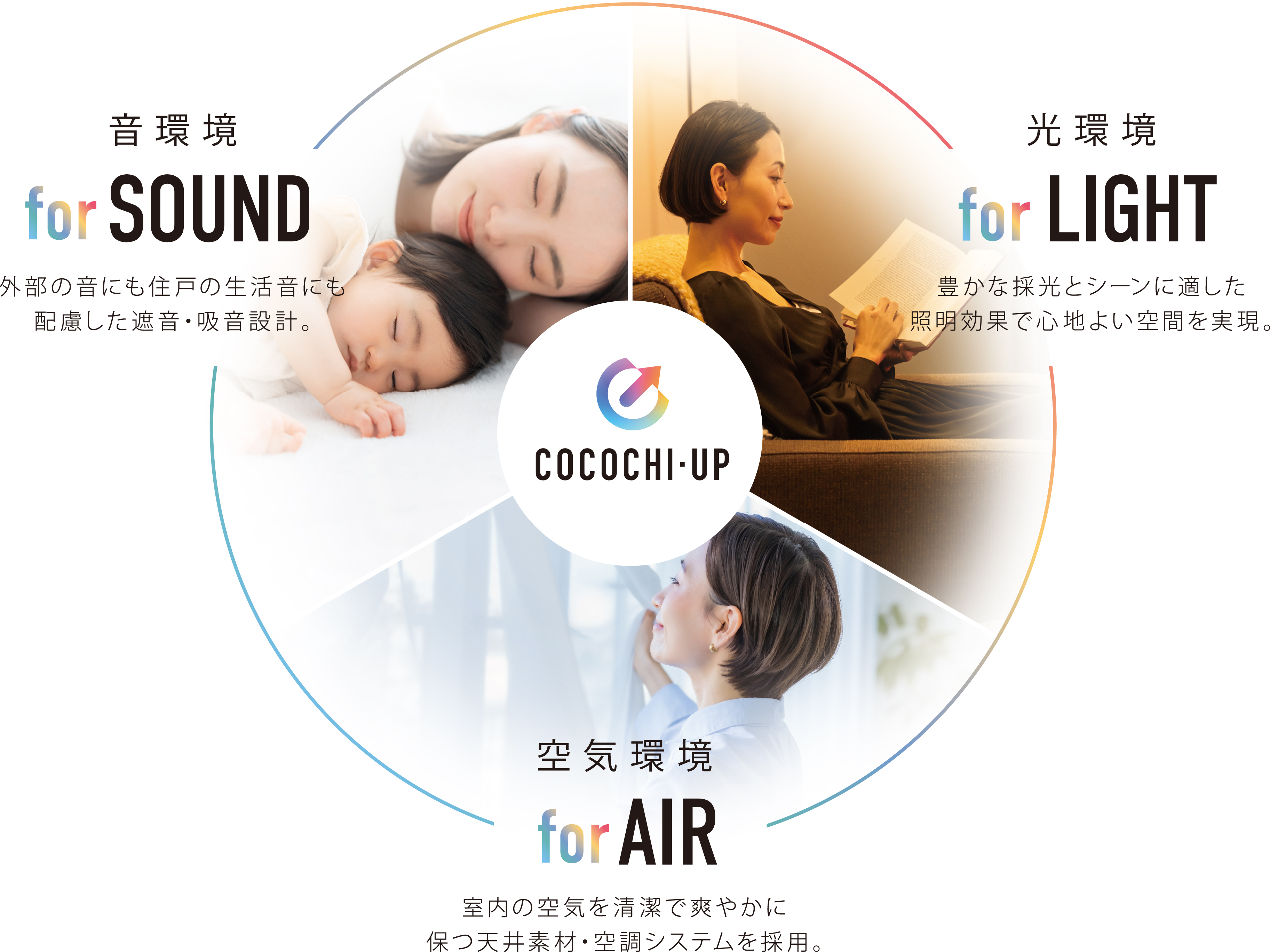 居住環境の基盤となる「光・空気・音」の3つの要素を機軸に、さらなる快適性を高める施策を総称し、「快適空間シリーズ『COCOCHI-UP』」と命名しました。