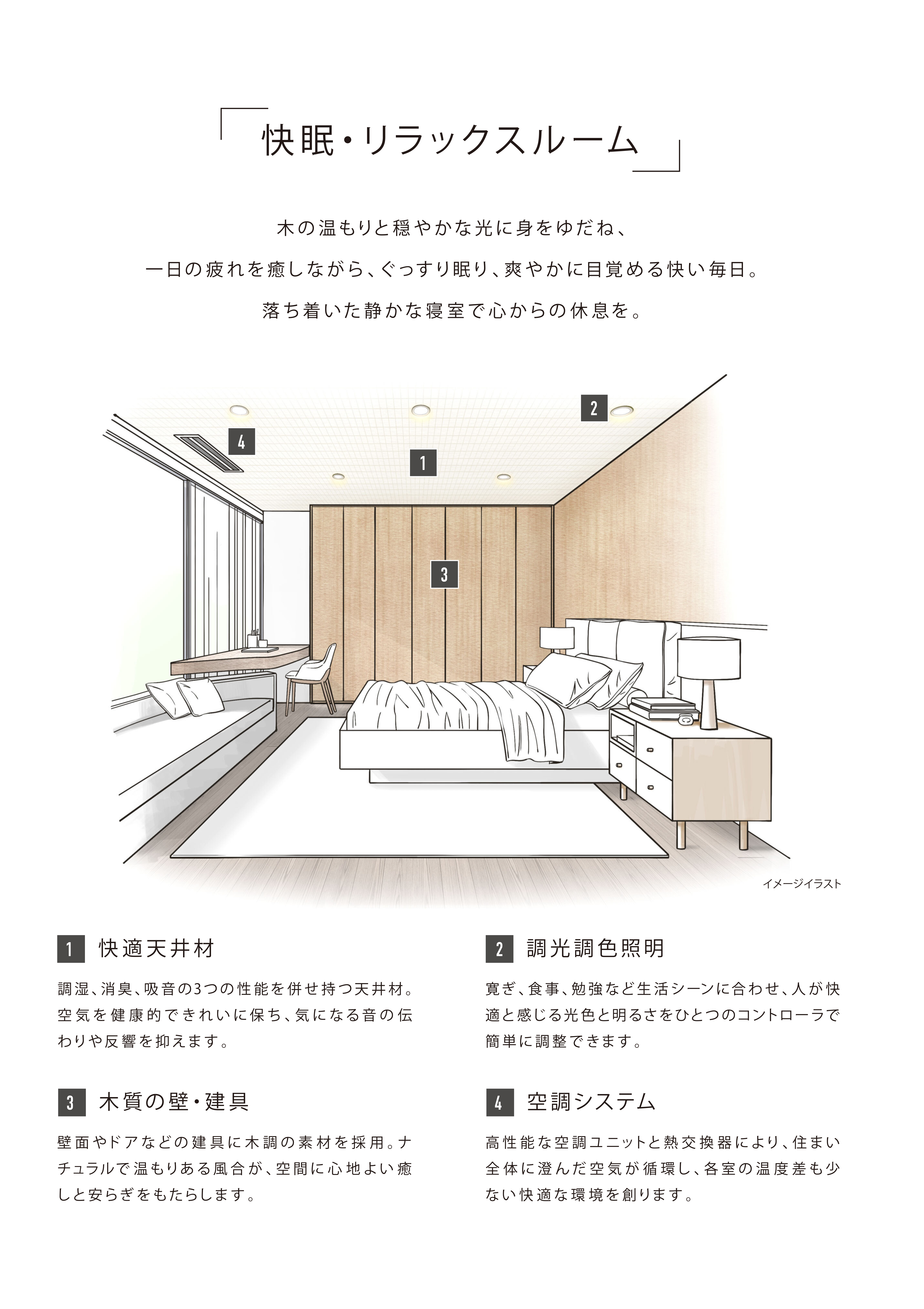 当社が、これまで採用してきた快適性向上に関する設備・仕様に加え、今後新たに企画・導入する多様な要素を融合させることで、新たな快適空間を創造し、五感に優しく心地よい住まいを提供してまいります。お客様の心に響く快適な空間を追求し、今後も順次ラインナップを拡充する予定です。