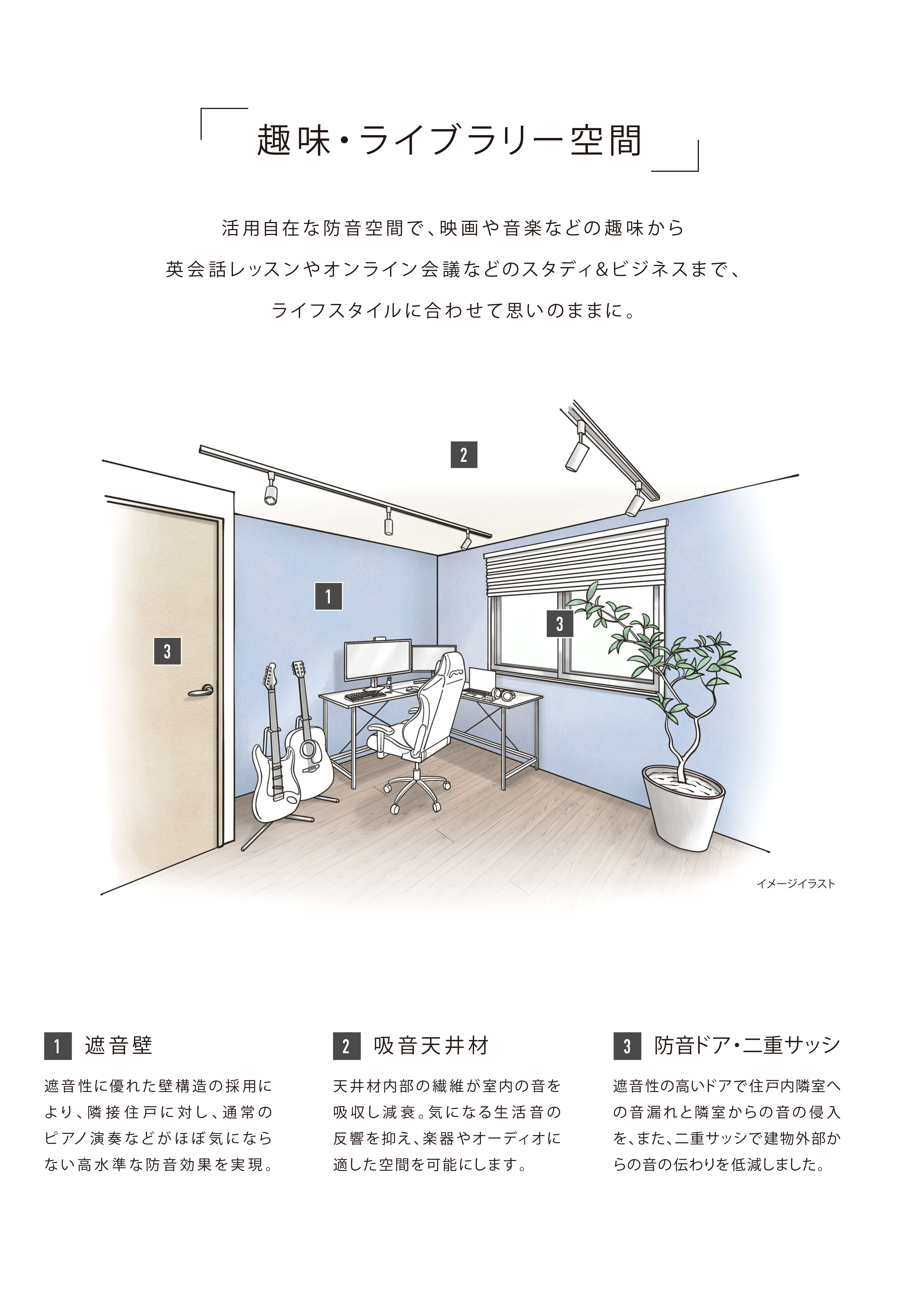 例えば、既に「CREVIA」で採用している快適天井材と調光調色照明や木質の壁・建具を組み合わせた「快眠・リラックスルーム」をはじめ、吸音天井材と遮音壁や防音ドアを組み合わせた「趣味・ライブラリー空間」などを提案していきたいと考えています。