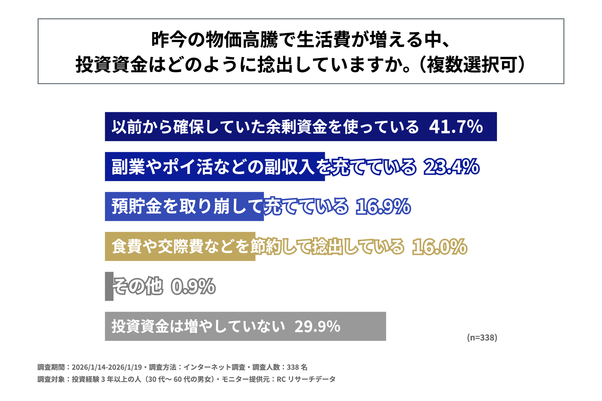 次に、「昨今の物価高騰で生活費が増える中、投資資金はどのように捻出しているか」を尋ねる設問への回答では、1位が「以前から確保していた余剰資金を使っている」で41.7%、2位が「投資資金は増やしていない」で29.9%、3位が「副業やポイ活などの副収入を充てている」で23.4%という結果になりました。この結果から、投資経験3年以上の人の約4割が、物価高騰で生活費が増える中での投資資金の捻出方法として「以前から確保していた余剰資金を使用している」ことが明らかになりました。