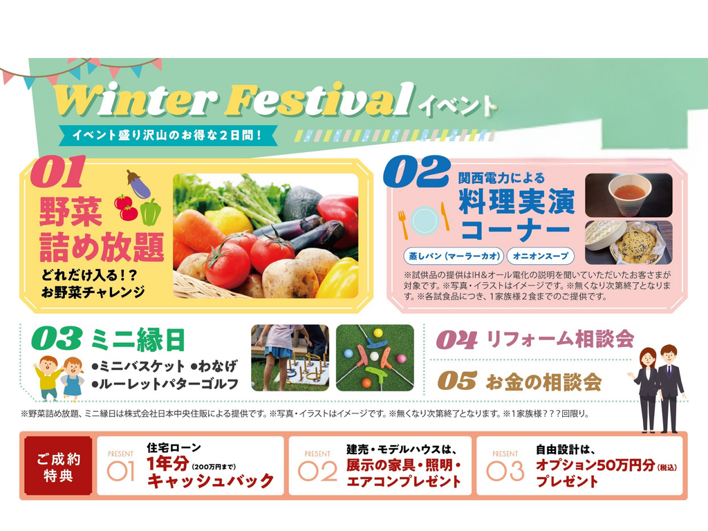 株式会社日本中央住販は、2月16日(月)から2月23日(月・祝)までの8日間、創業40年目を記念したイベント第3弾、「ハートフルビレッジ九条駅前 Winter Festival」を開催いたします。期間中は、住まいづくりを検討されている方に向けた成約キャンペーンを実施。さらに2月21日(土)・22日(日)の2日間は、新モデルハウス完成を記念した体験型イベントを開催し、家族みんなで楽しみながら住まいについて学べる機会をご提供します。