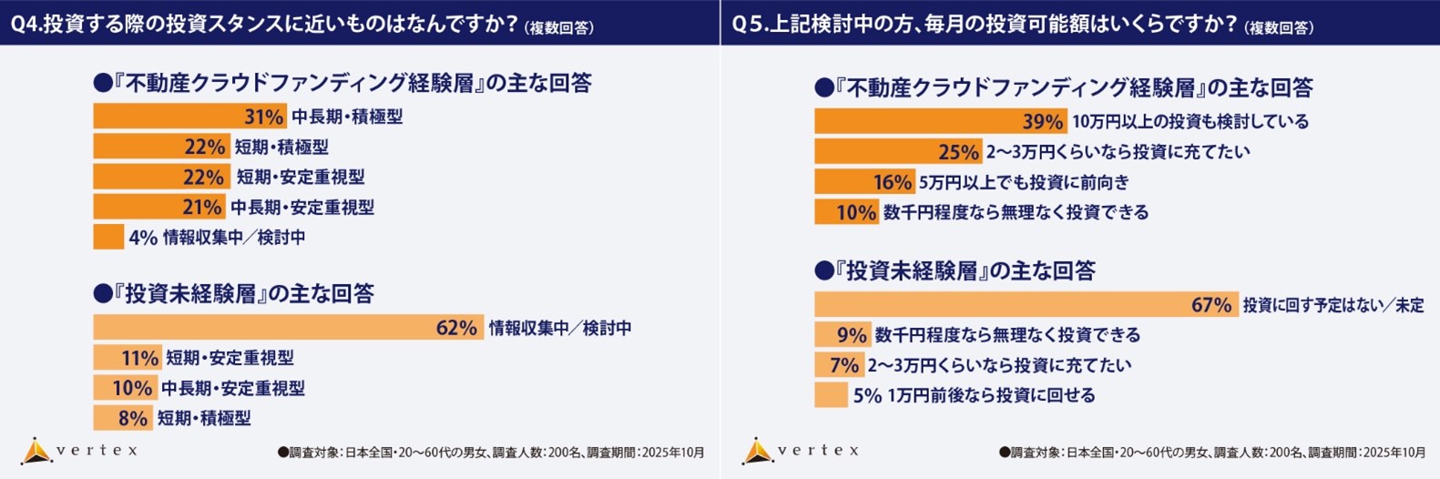 回答者の属性を➀不動産クラウドファンディング経験層、➁不動産クラウドファンディング検討層(興味あり、または過去に投資経験がある)、➂不動産クラウドファンディング未経験層(他の投資商品には興味あり、または投資経験あり)④すべての投資経験なし(過去に保有経験もなし)に分類し、本リリースでは➀不動産クラウドファンディング経験層︓100名と④すべての投資経験なし(過去に保有経験もなし)︓100名の投資意識について分析しています。
