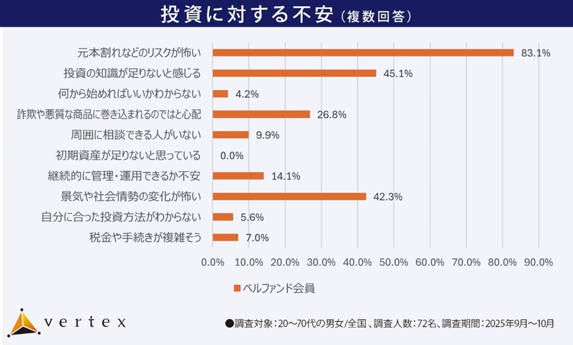 <投資に対する不安>についての設問では、会員の多くが「元本割れなどのリスクが怖い」、「投資の知識が足りない」ことを不安に挙げており、『ベルファンド』は知識不足による投資リスクへの不安を感じているような初心者の方にも選ばれていることが分かります。