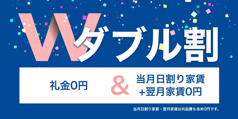 本キャンペーンは、契約金から礼金、当月日割家賃・共益費、翌月家賃・共益費を不要とし、入居者様の初期費用負担を軽減し、ご契約いただける内容となっています。*