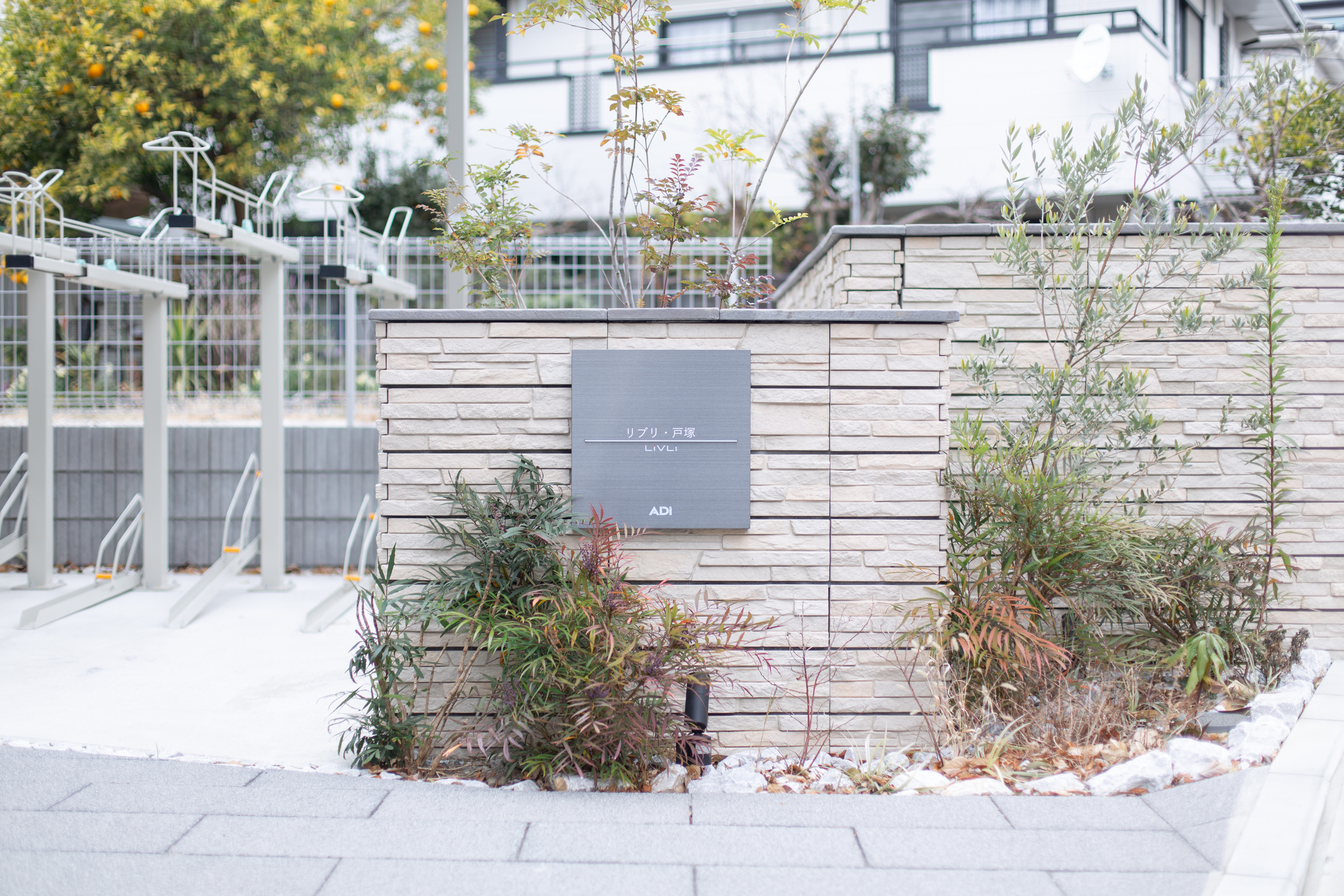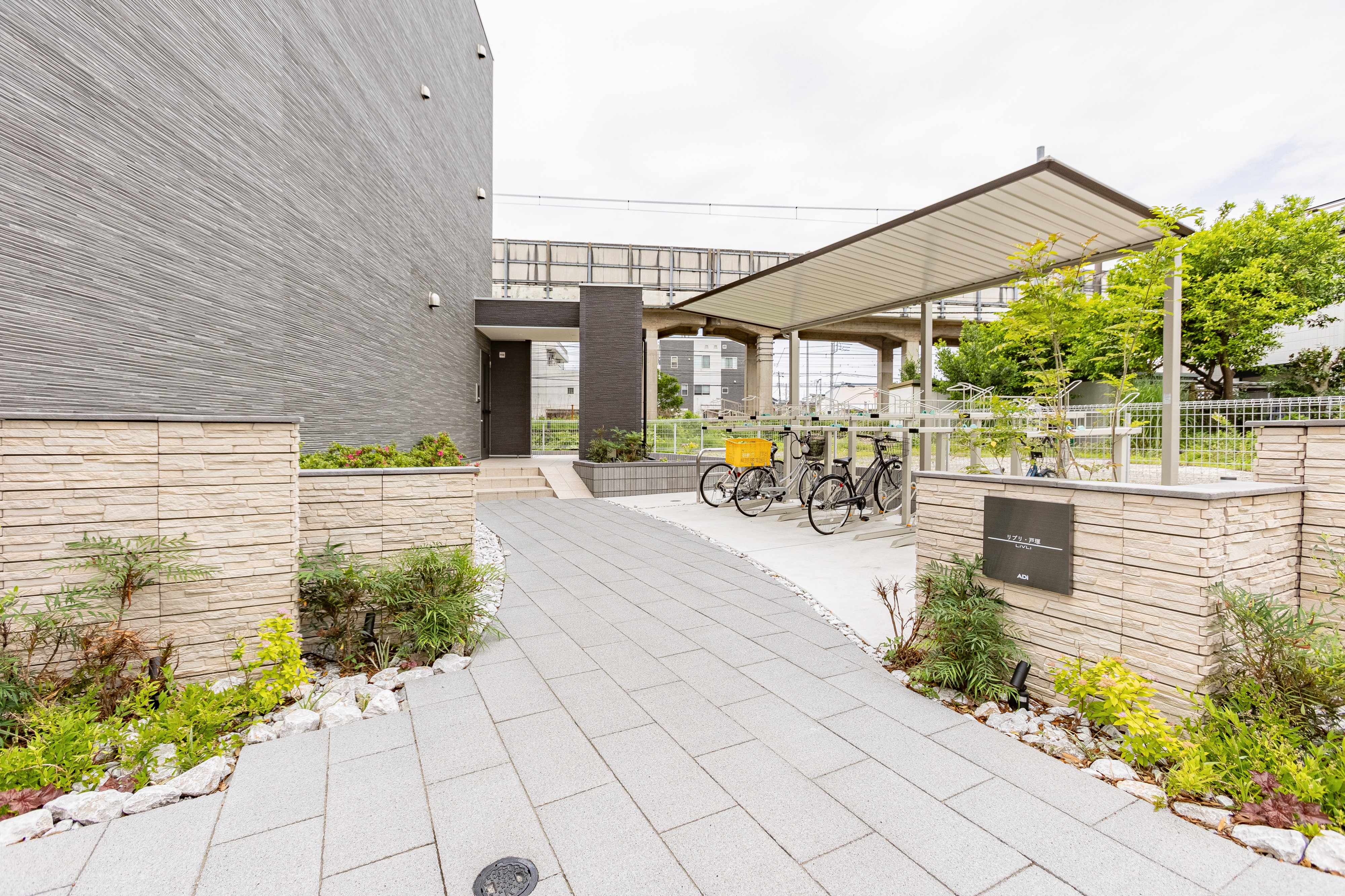 本物件はエントランスから道路までのアプローチが末広がりの形状となっており、駐輪場を視線から巧みに隠しながら空間を構成しています。