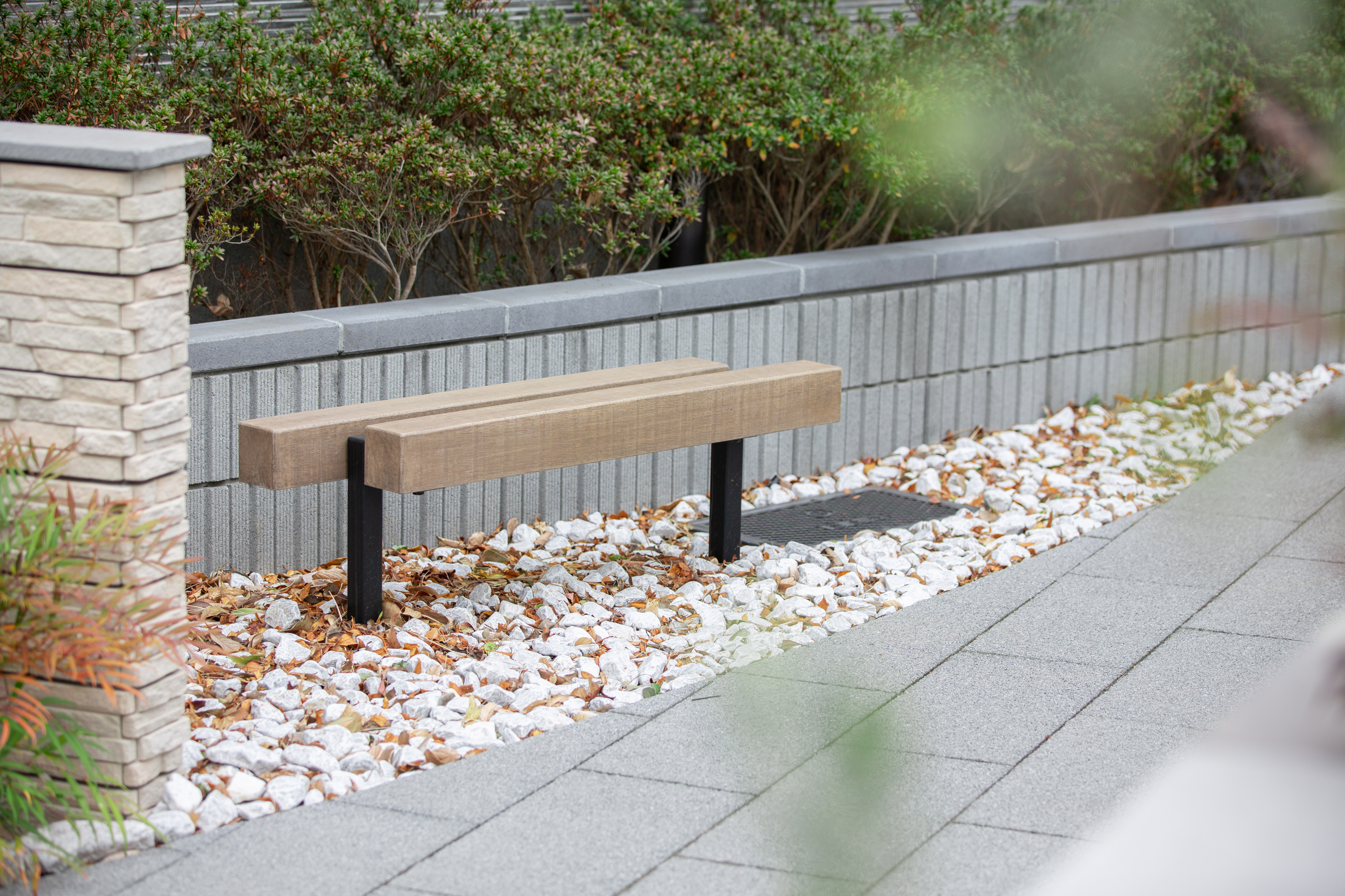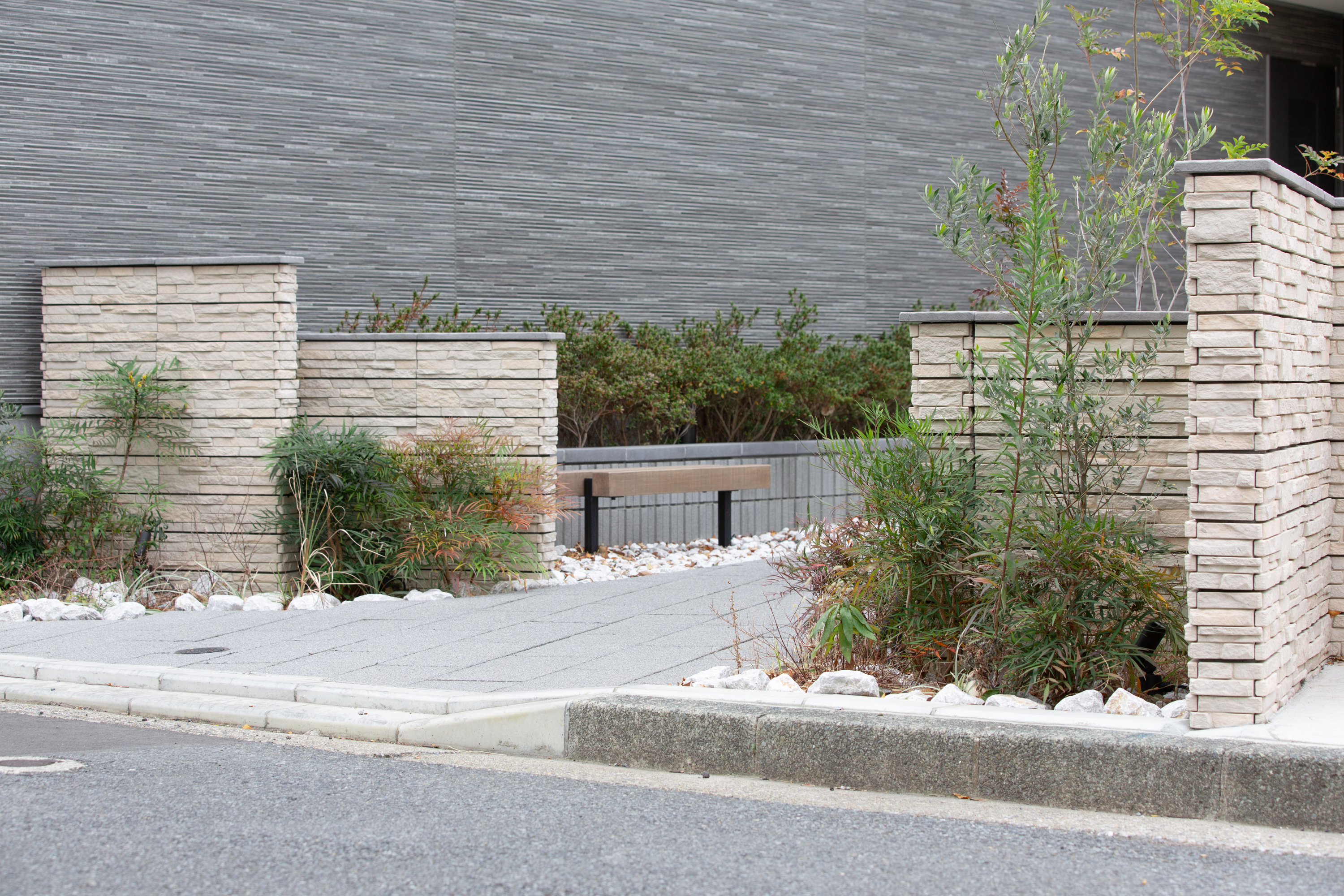 グレーの建物外観に合わせ、床面はフラグペイブのグレー、化粧CB塀には エレガシシリーズ ラッジウォール ビッケ を採用し、グレーとベージュの絶妙なカラーリングバランスを実現しました。