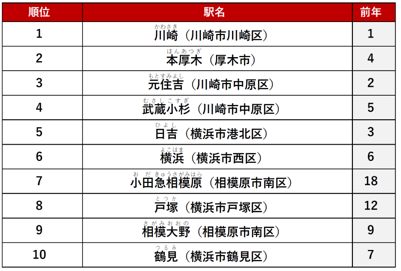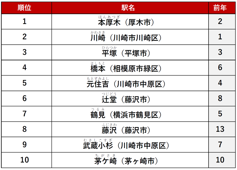 2位に「川崎」駅、3位「平塚」駅がランクインしました。