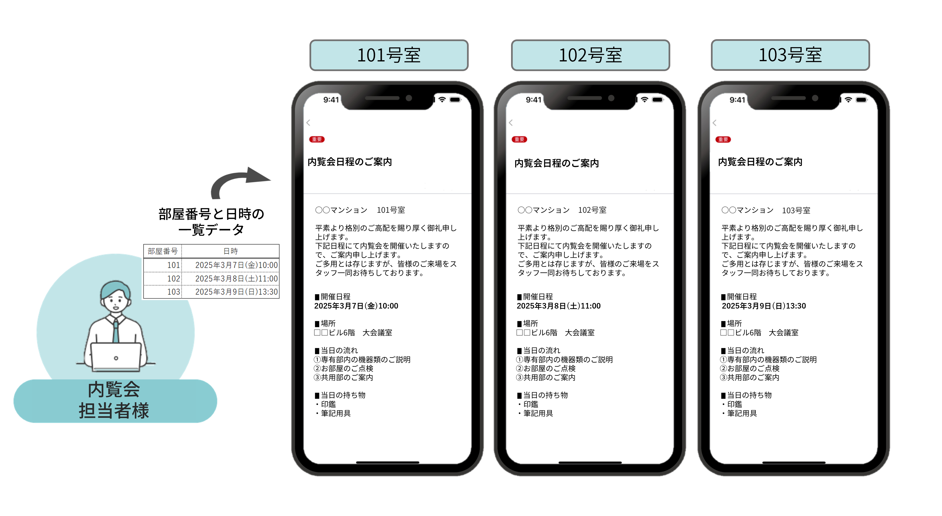 分譲マンションにおいては、内覧会やアフターサービスの日程の案内等、住戸毎に異なる情報を含むご案内は、差し込み印刷した紙を郵送するシーンが多くありますが、本機能を使用することで簡単な操作でアプリへの一括配信が可能となり、印刷・封入・投函の手間、郵便代をゼロにし、DX化に大きく寄与します。