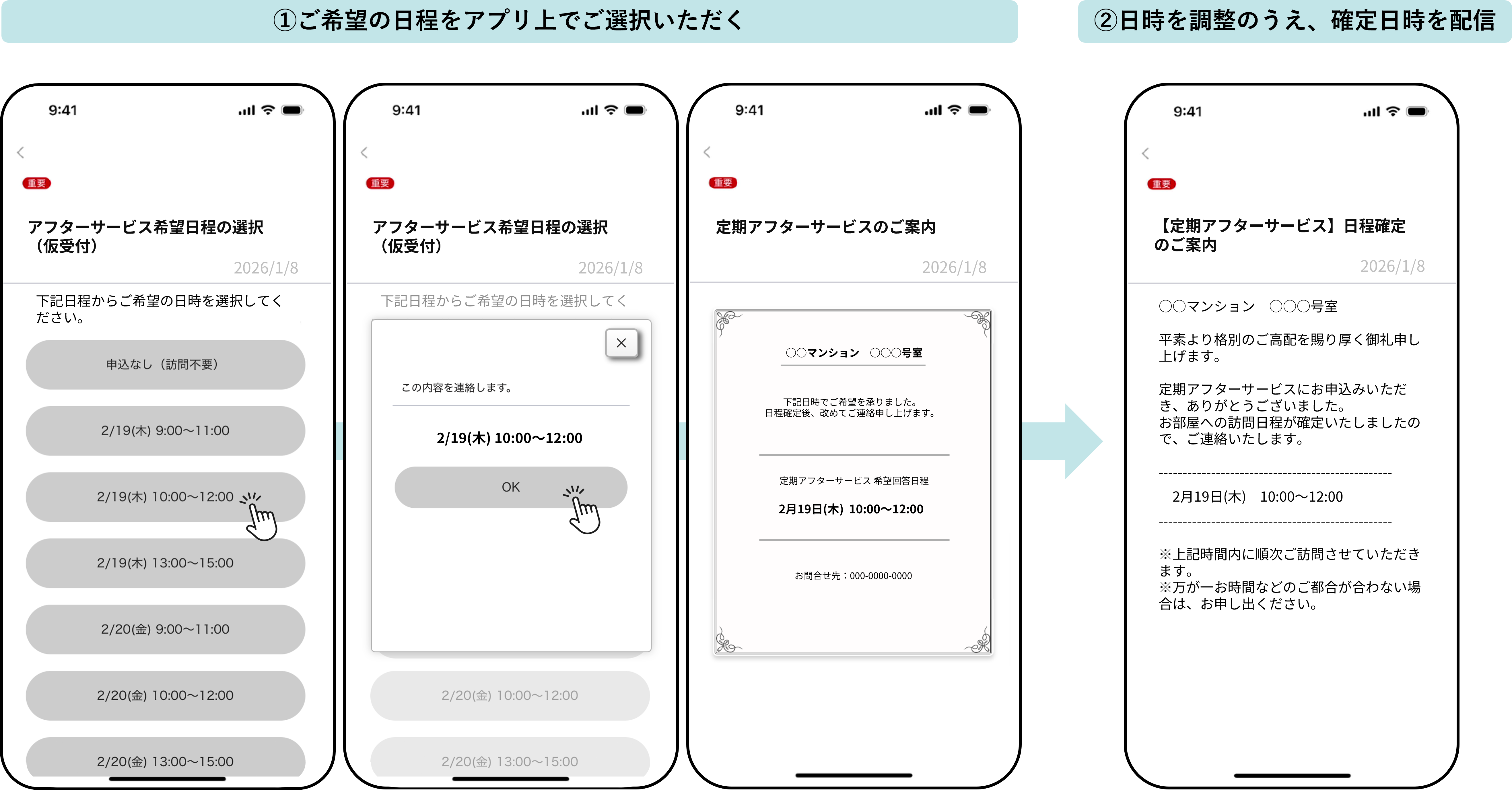 本機能は、アプリStationの既存機能である「日程調整アンケート機能」と組み合わせることで、より便利にご利用いただけます。例えば定期アフターサービスの場合、日程調整アンケート機能を通じて居住者から工事希望日をご回答いただき、その後、ご担当者様が本機能を用いて確定日程を対象住戸へ配信するという一連のプロセスがアプリ上で実現可能です。