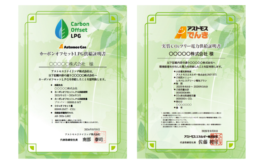 「カーボンオフセットLPG供給証明書」「実質CO₂フリー電力供給証明書」発行の開始