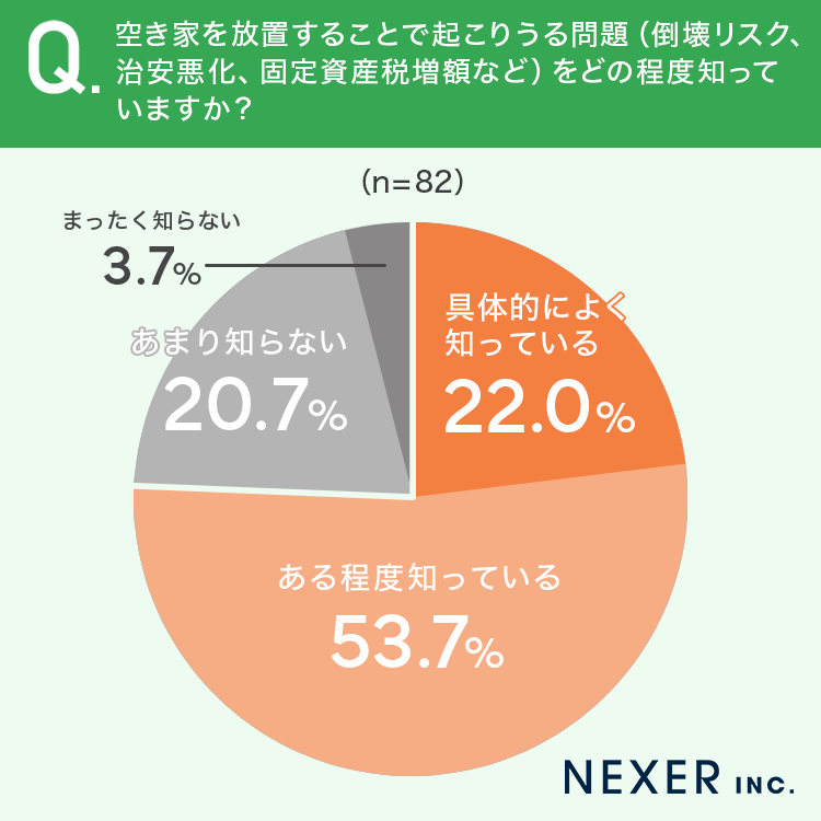 質問1:空き家を放置することで起こりうる問題(倒壊リスク、治安悪化、固定資産税増額など)をどの程度知っていますか?