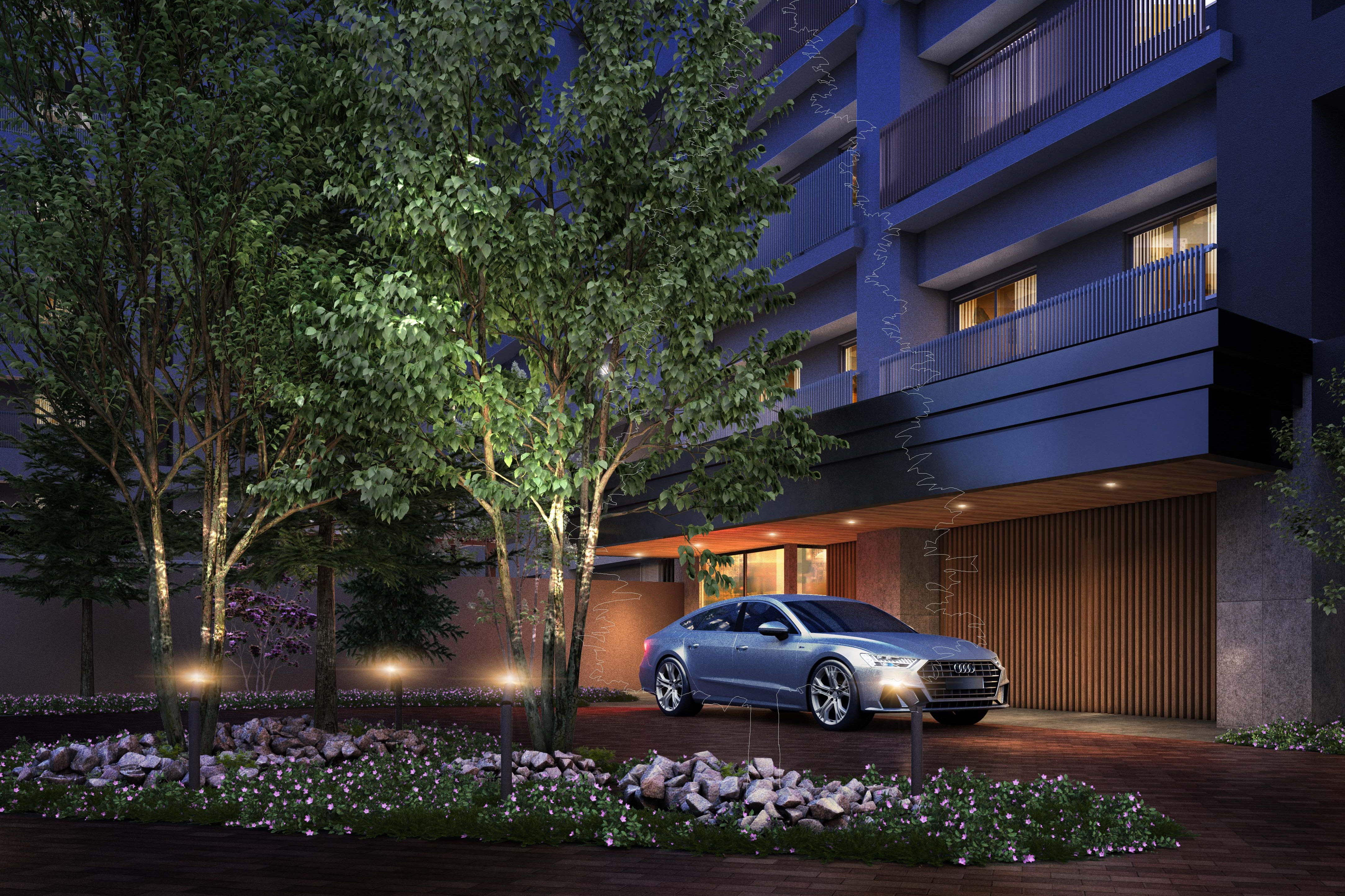 共用部は、メインエントランスのほかに、車寄せを備えたサブエントランスを設けることで歩車分離を行っているほか、住戸に対して100%の設置率※1となる駐車場を確保し、カーライフの利便性を高めました。また、2層吹き抜けの広々としたラウンジには、帯広の土地を想起させるアートを配置し、美術館を彷彿とさせるくつろぎの空間を創出しています。