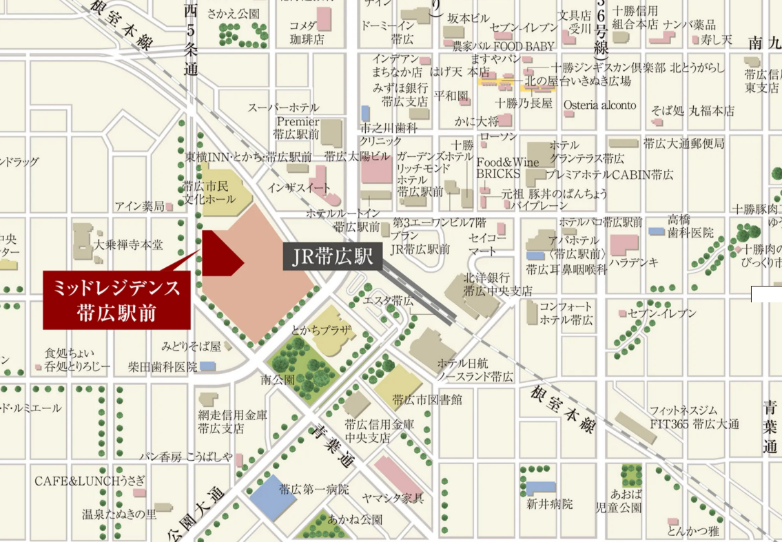 当物件は、JR「帯広」駅前の商業施設跡地において進行中の「(仮称)帯広駅南口再開発プロジェクト」内に位置しており、商業施設やホテル、市民が自由に集える開放感あふれる広場の整備が予定された、更なる発展の見込めるエリアに誕生します。周辺には、徒歩10分圏内に商業施設や医療機関、金融機関などの生活利便施設のほか、図書館、イベントホールなどの文化施設も揃っております。さらに少し足を延ばせば、動物園や美術館がある広大な「緑ヶ丘公園」も利用可能であり、自然や文化を享受できる充実した住環境です。