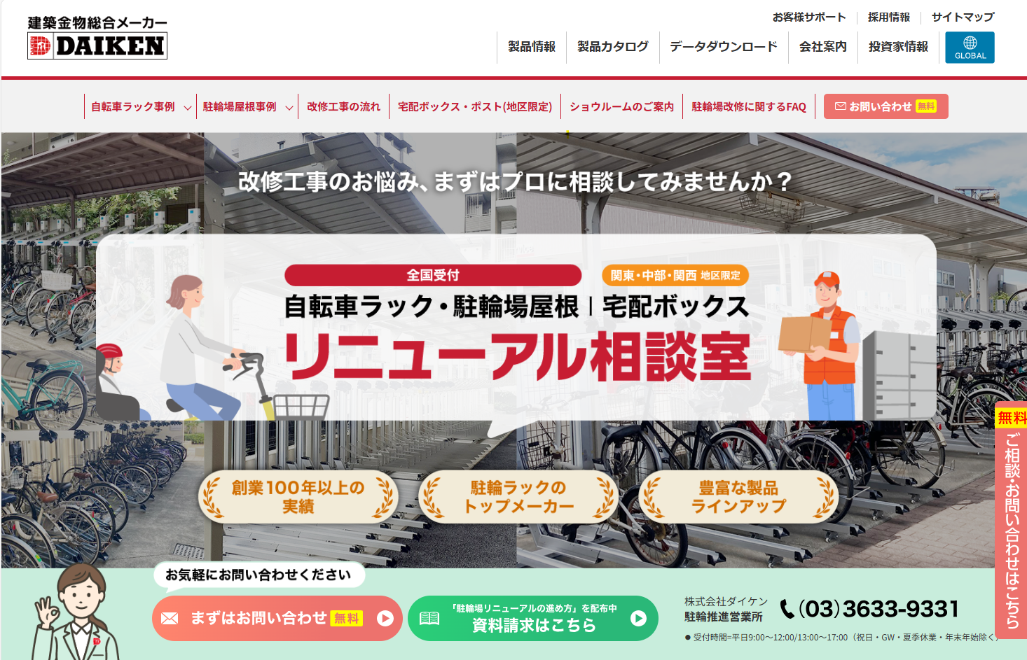 建築金物・外装用建材・エクステリアなどの総合メーカー、株式会社ダイケン(本社:大阪市淀川区 社長:藤岡洋一)は、集合住宅や店舗、各種施設における駐輪場改修工事をご検討中のお客様を対象に、当社ウェブサイト内の改修工事受付ページ『リニューアル相談室』を全面的に刷新いたしました。