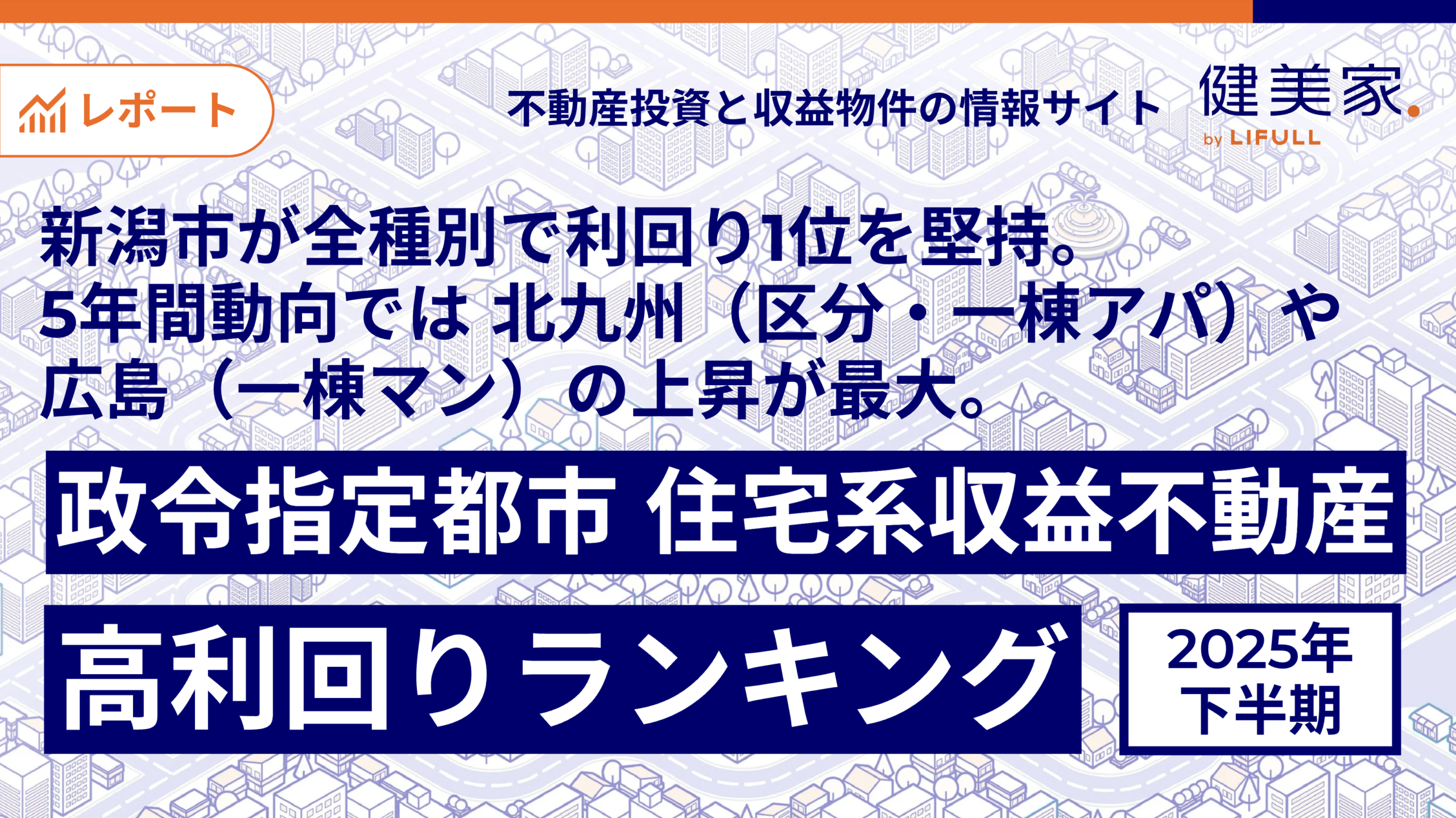事業を通して社会課題解決に取り組む株式会社LIFULLのグループ会社であり、不動産投資と収益物件の情報サイト「健美家(以下、健美家)」および「LIFULL HOME’S 不動産投資」を運営する健美家株式会社(代表取締役社長:成瀬 亮輔)は、2025年7月〜12月期に登録された全国の住宅系収益不動産3種別(区分マンション・一棟アパート・一棟マンション)を集計し、政令指定都市別の利回りを「政令指定都市 高利回りランキング」として公開しました。
