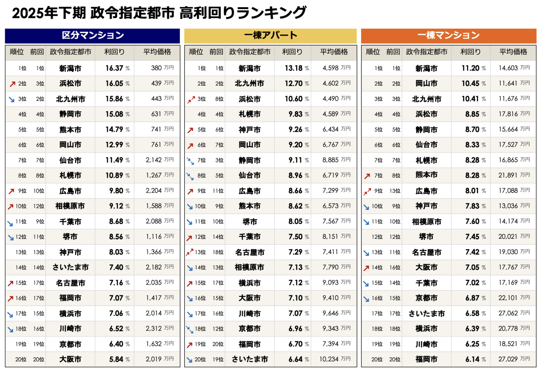 ・新潟市が、区分マンション(16.37%)、一棟アパート(13.18%)、一棟マンション(11.20%)の全3種別で利回り1位を獲得し、前回調査に続き首位を堅持。