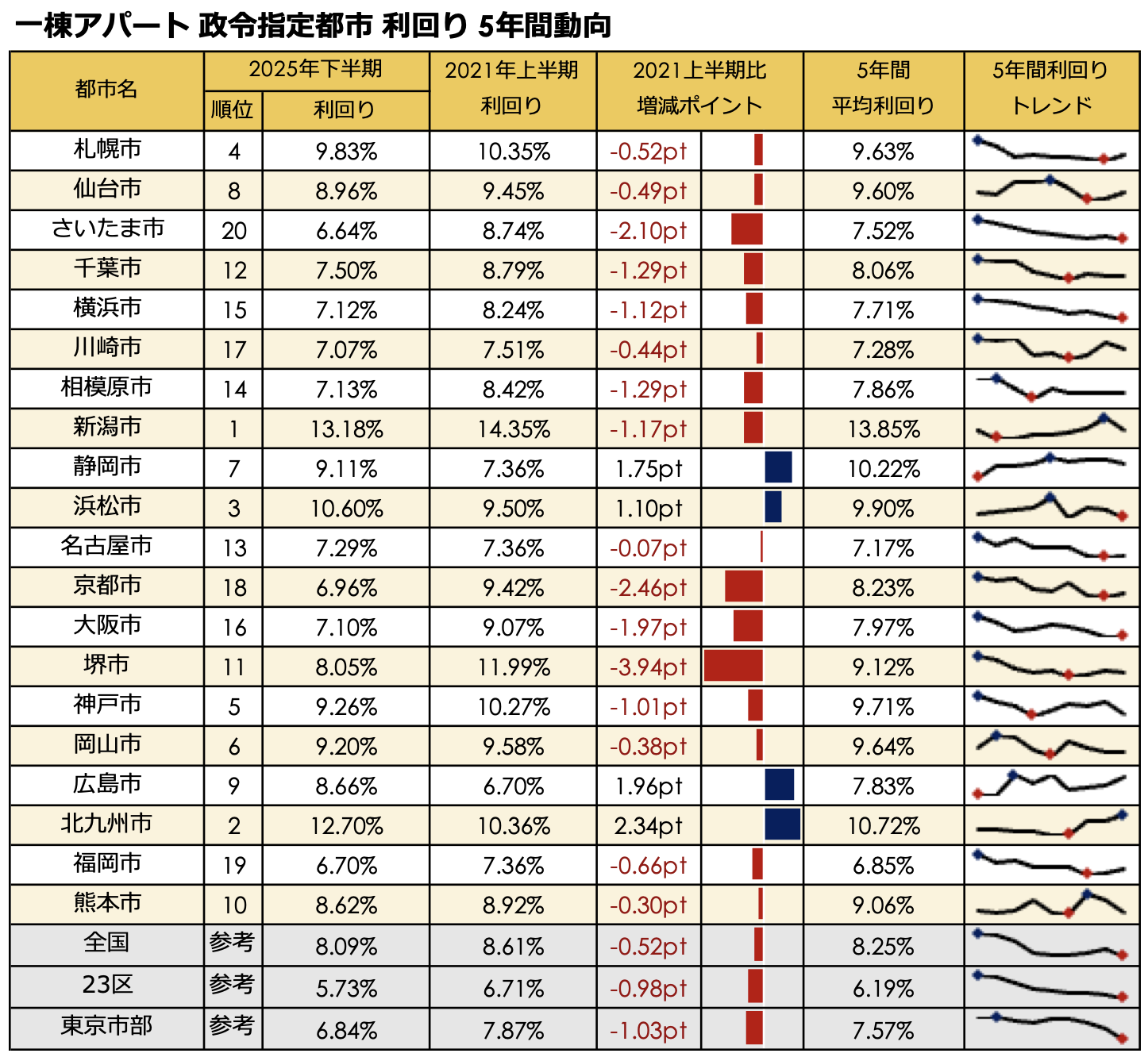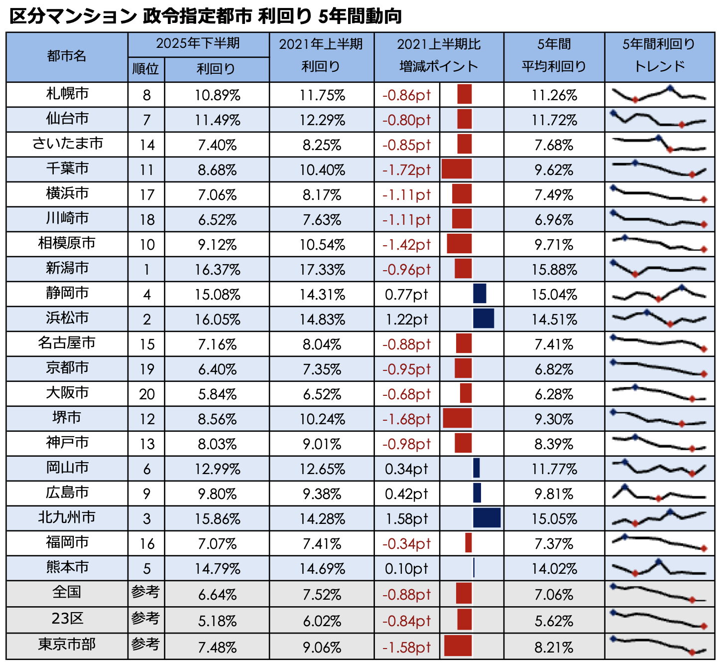 2021年上期と比較すると、北九州市が+1.58ptと最も利回りが上昇しました。次いで浜松市(+1.22pt)、静岡市(+0.77pt)と続いています。一方で、2021年上期から利回りが大きく低下したのは、千葉市(-1.72pt)、堺市(-1.68pt)、相模原市(-1.42pt)の順となりました。