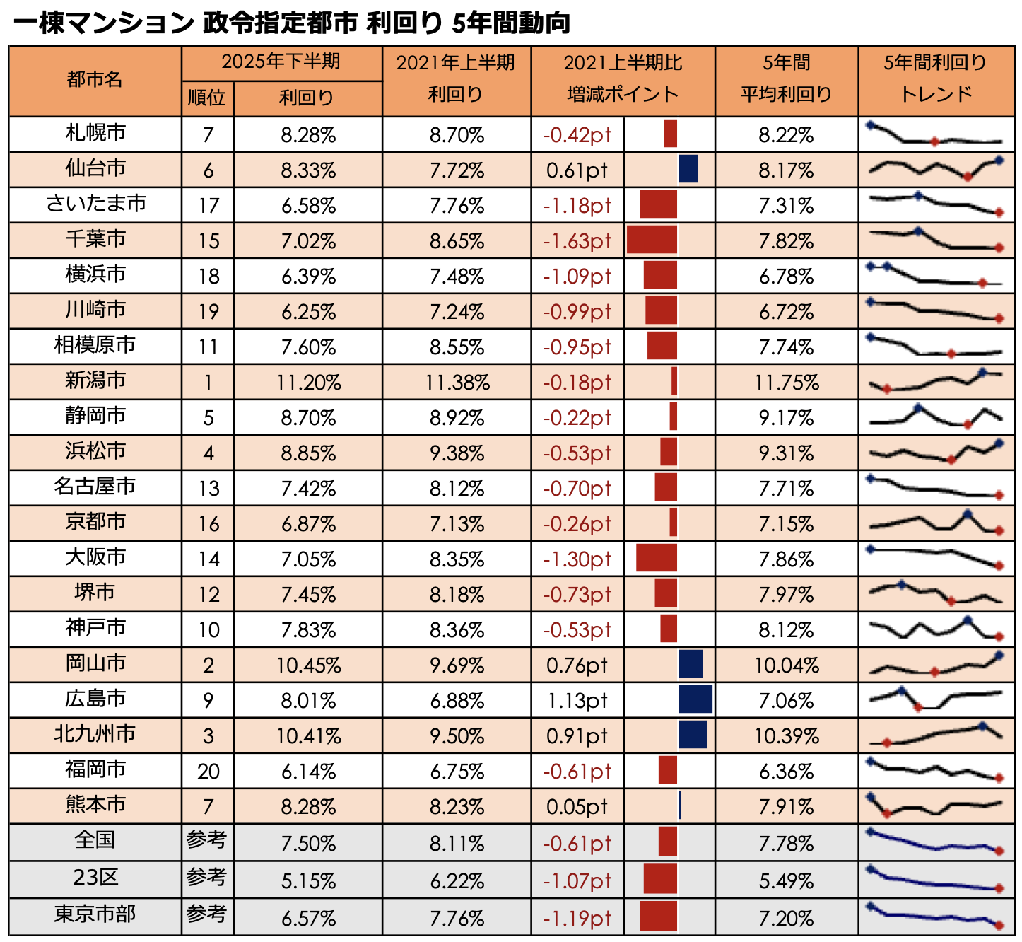 2021年上期と比較すると、北九州市が+2.34ptと最も利回りが上昇しました 。次いで広島市(+1.96pt)、静岡市(+1.75pt)の順となっており、特に静岡市は2021年上期から平均価格が5,585万円上昇しながらも、利回りも大きく上昇する結果となっています。
