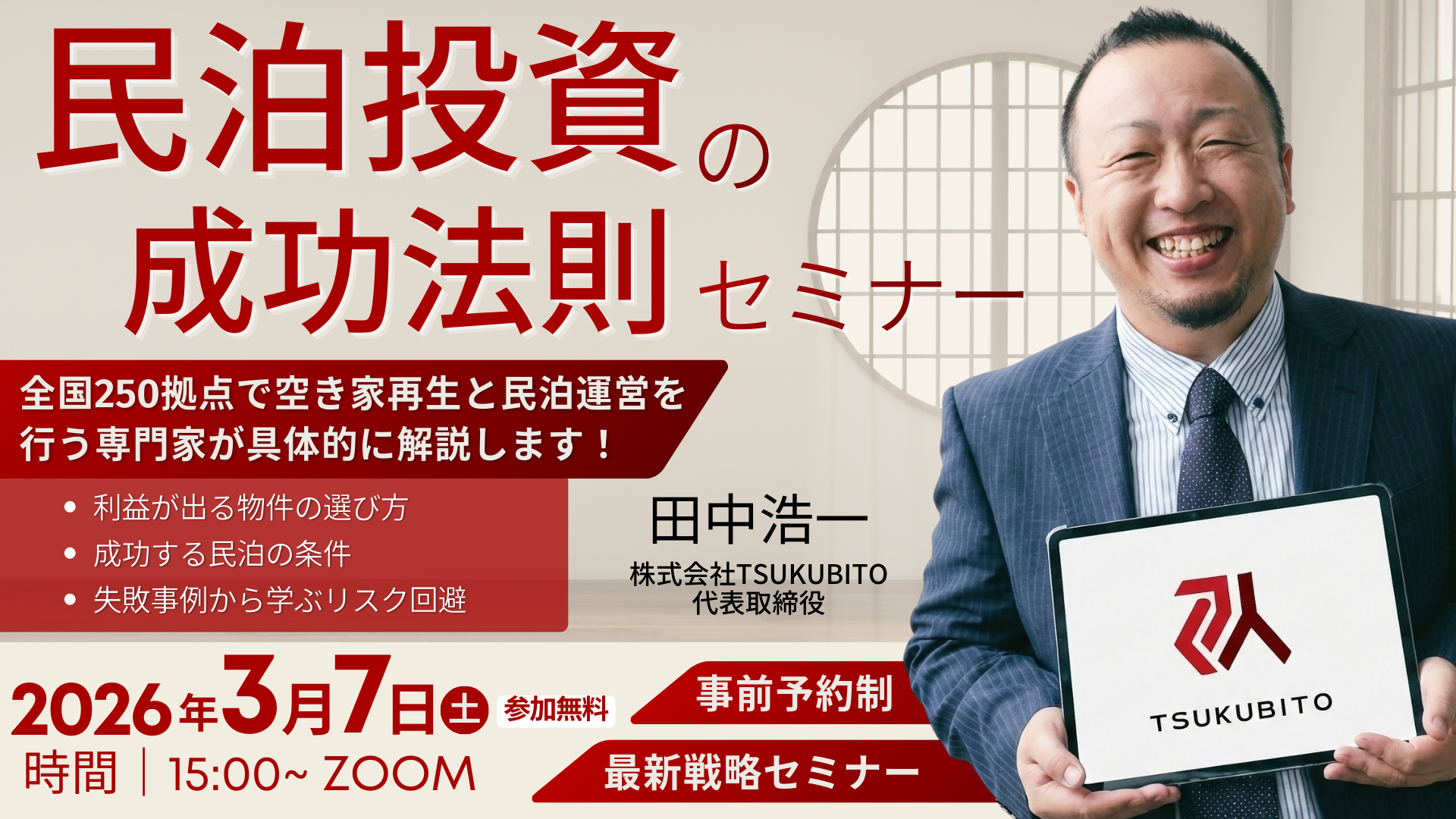 全国250拠点で空き家再生と民泊運営を行う専門家が、「利益が出る物件の選び方」「成功する民泊の条件」「失敗事例から学ぶリスク回避」を具体的に解説します。