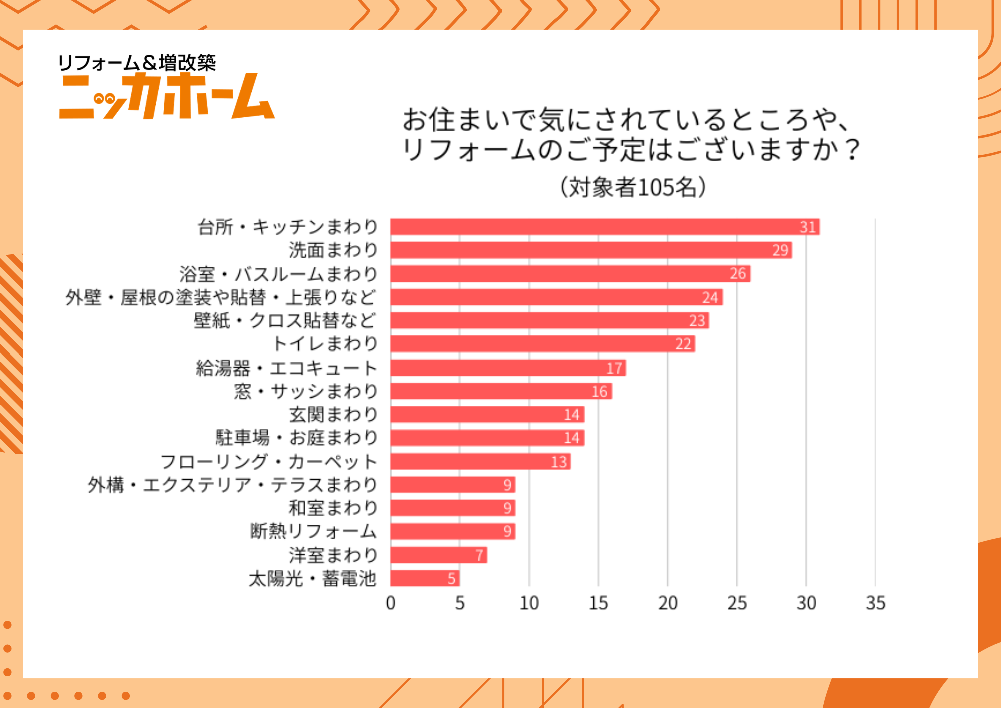 「お住まいで気にされているところや、リフォームのご予定はございますか?」の質問に対し、105名*の方に複数回答可の「リフォーム検討部位」のアンケートを実施した結果によると「台所・キッチンまわり」を検討いただいている方が共にもっとも多く31名、次いで「洗面まわり」を検討いただいている方が29名でした。