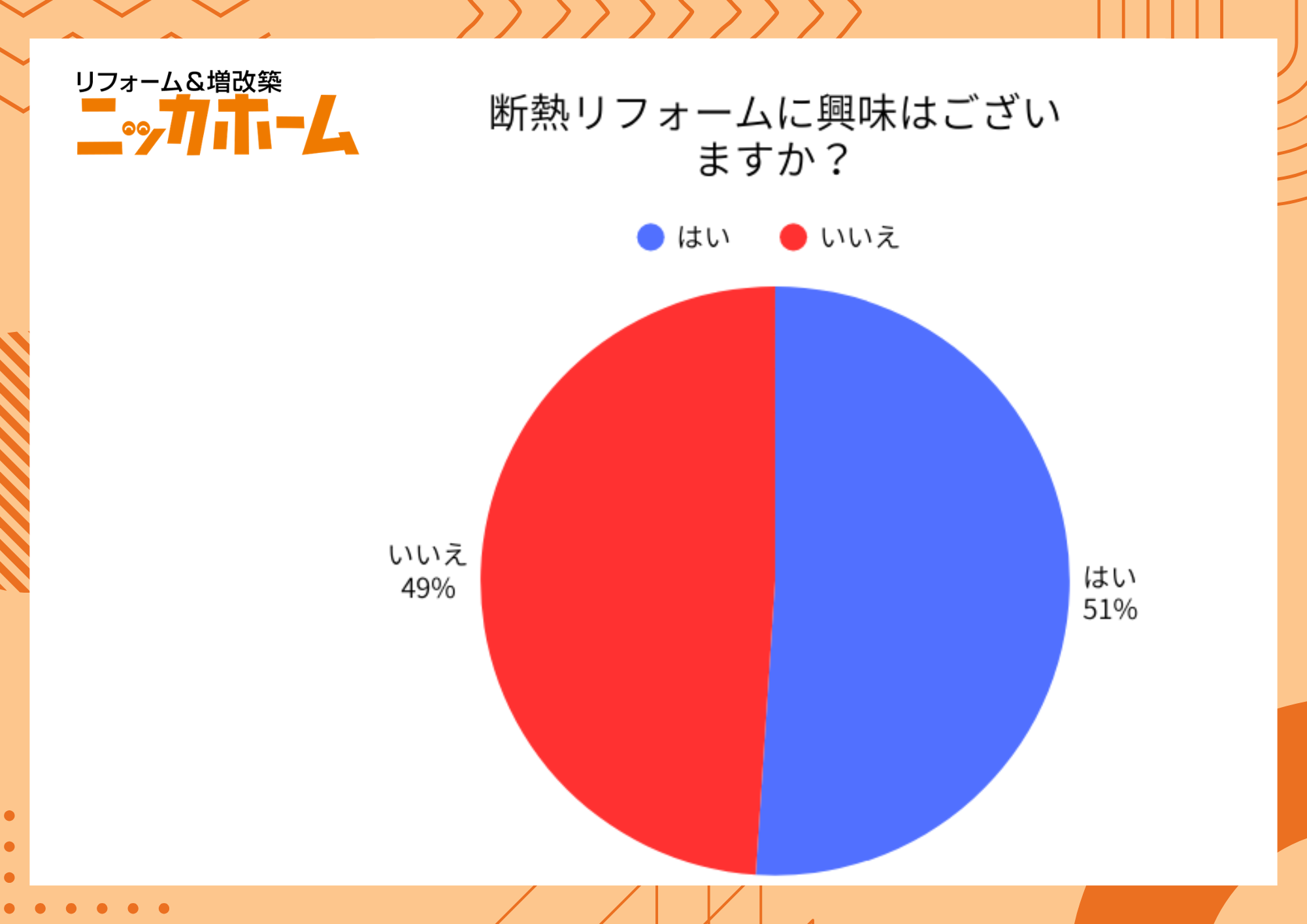 「断熱リフォームにご興味はございますか?」の質問に対して、「はい」と答えた人は全体の51.0%でした。
