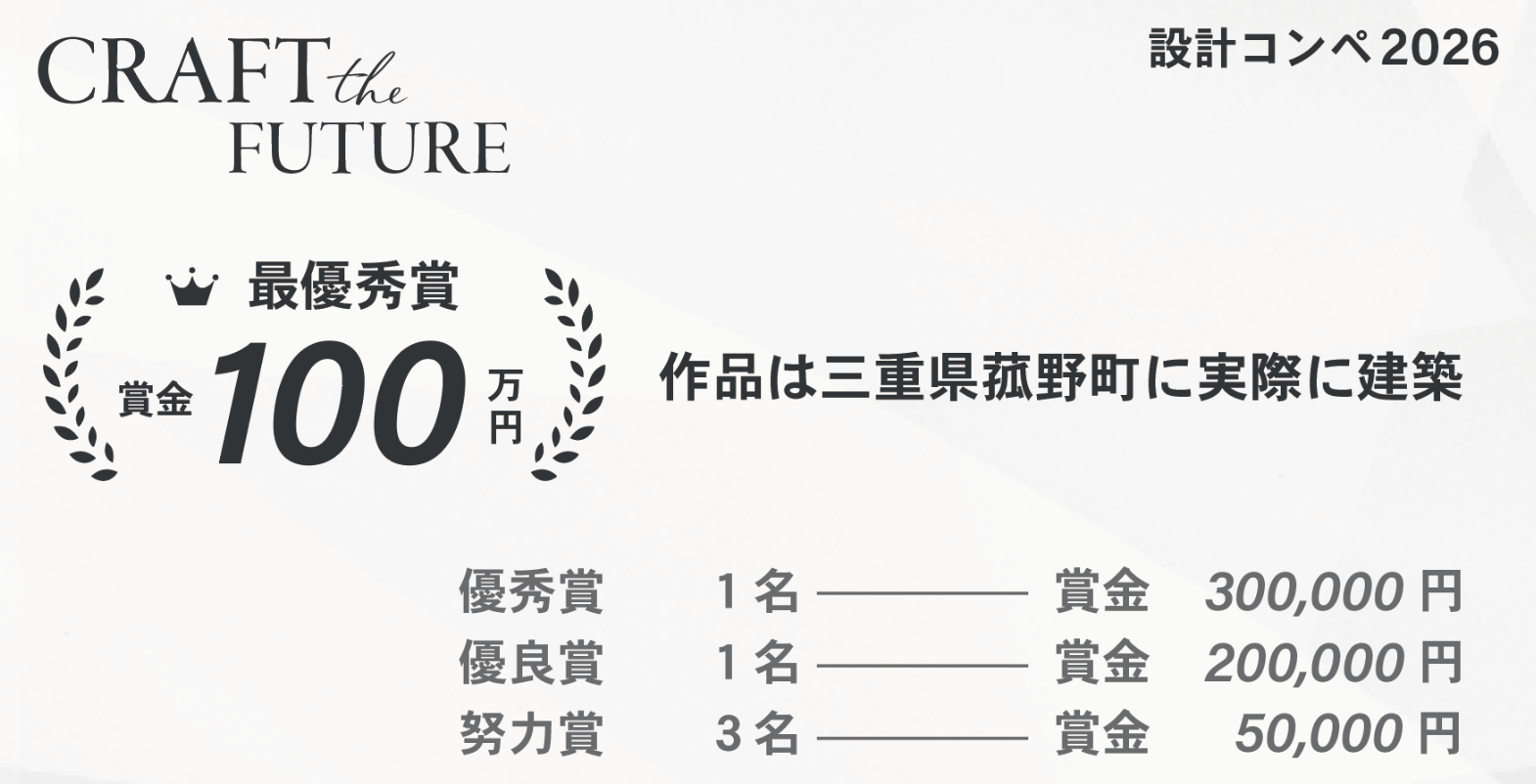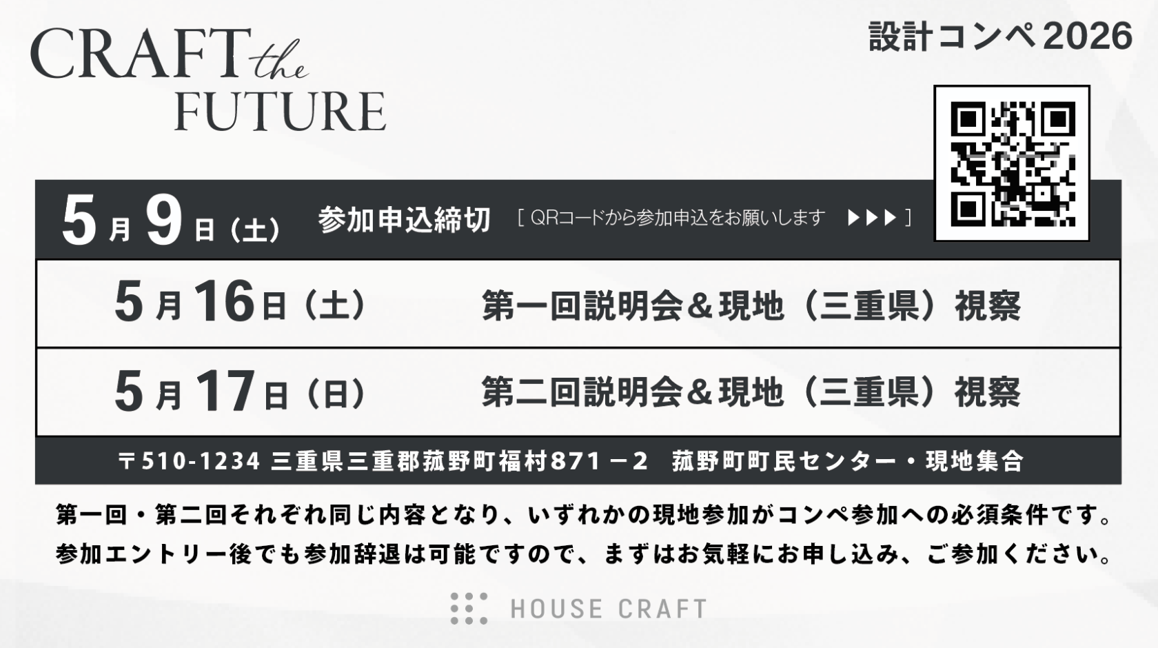 三重県を中心に注文住宅の設計・施工を手がけるハウスクラフト株式会社(本社:三重県三重郡菰野町、代表取締役社長:遠藤 真二)は、建築を志す全国の学生を対象とした実践型設計コンペティション『Craft the Future 〜学生設計コンペ 2026 in 東海〜』を開催いたします。 本コンペの最大の特徴は、最優秀賞(賞金100万円)に選ばれた作品が、三重県菰野町に実際のモデルハウスとして建築される点です。