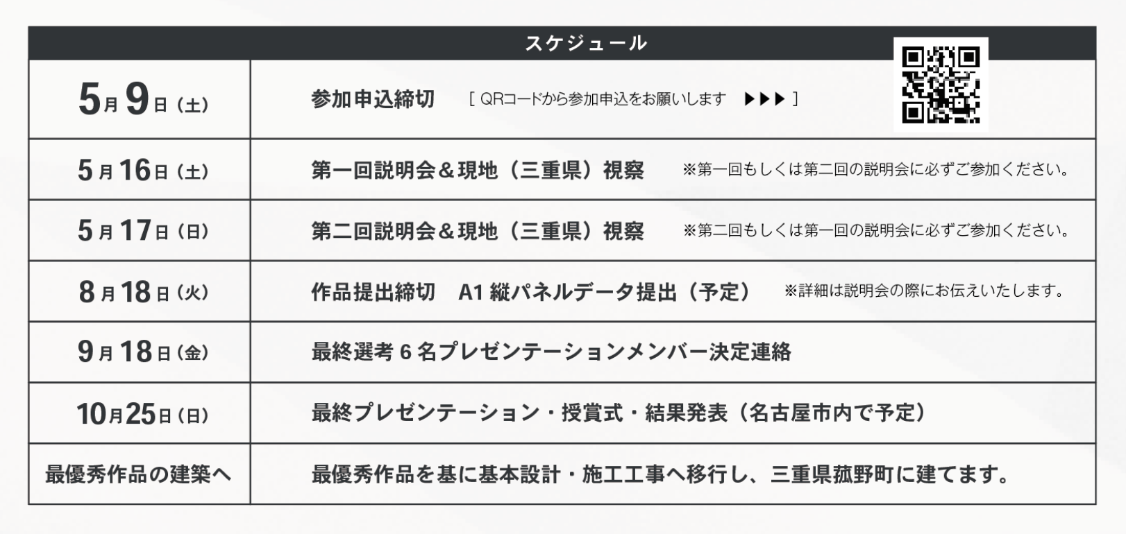 ●参加対象 : 三重県での現地視察や名古屋市内での最終審査に無理なく参加可能な建築系学生(大学生・専門学校生・高校建築科の学生)。 個人、またはチームでの応募が可能です。