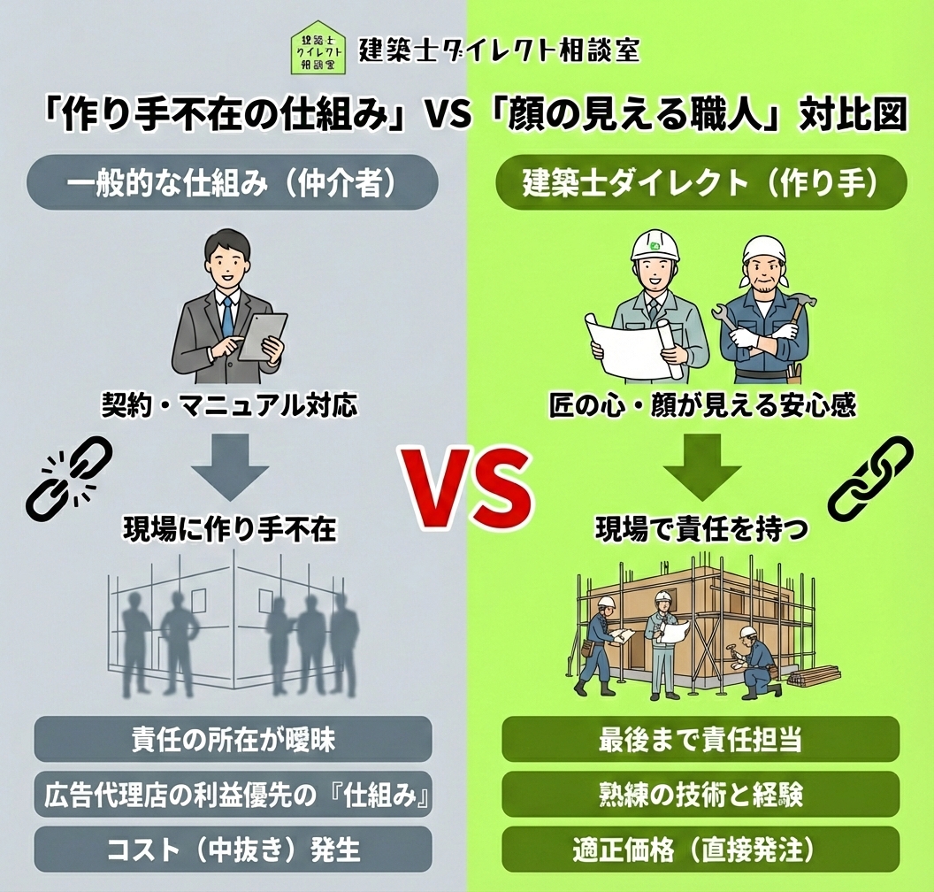 家づくりにおいて、本当の意味での「セカンドオピニオン」は存在しません。 現在、多くの「家づくり相談窓口」や「住宅会社紹介サイト」が存在しますが、彼ら仲介する人々は、お客様が契約をした後、泥まみれの工事現場に来ることは決してありません。 どのような経緯やプロセスがあろうと、最終的に現場で汗を流し、図面を形にし、お客様の財産と命に対する「最終的な責任」を取るのは、建築士と職人です。 そう考えると、何も責任を取らない人が、お客様と作り手の間に介在する必要性は少ないのです。