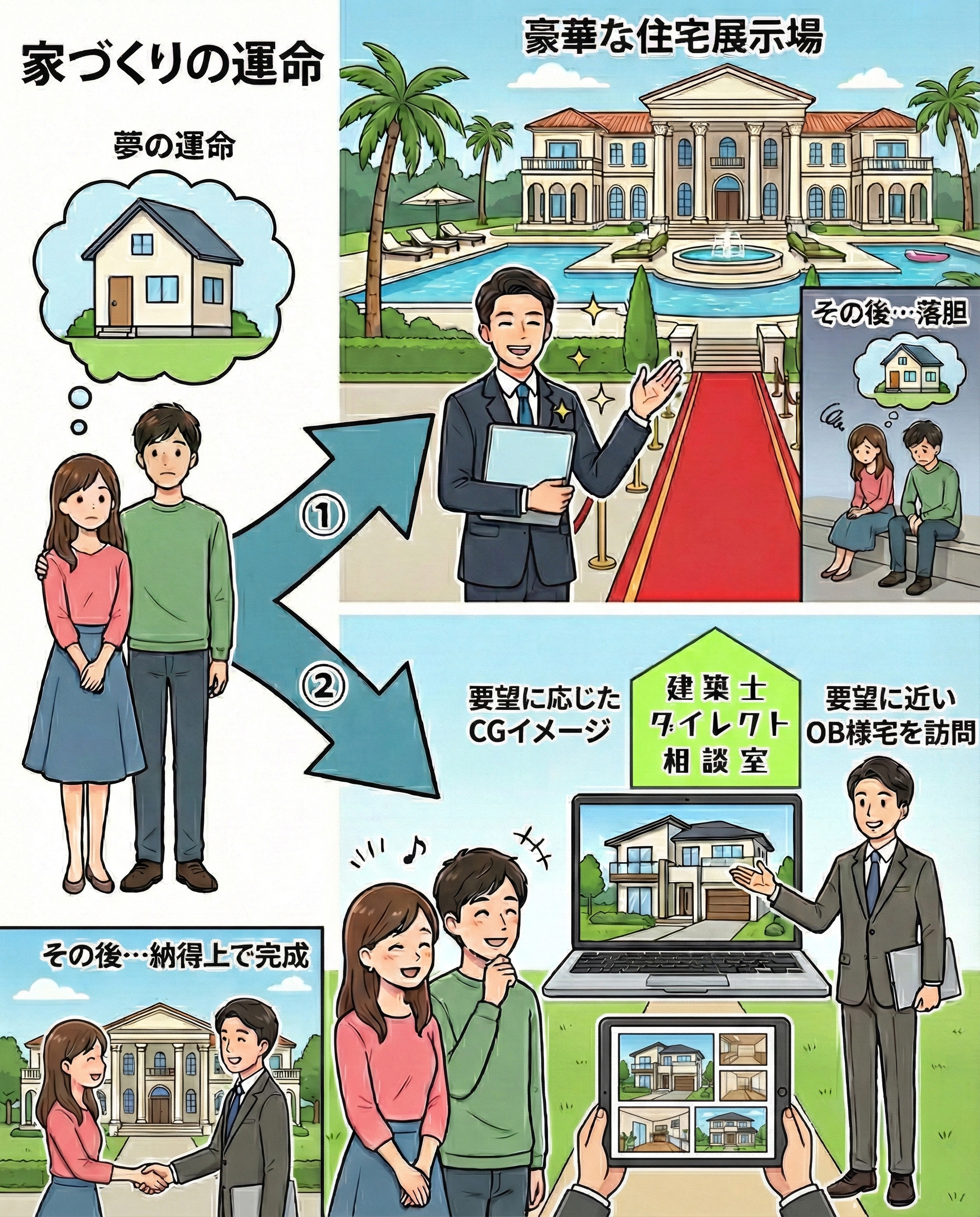 しかし、後日、建築士が図面を引き、構造や予算を把握した段階で、「構造的理由からの予算オーバー」「過剰スペックな設備からの予算オーバー」「建築基準法等に触れる」といった厳しい現実が突きつけられるケースが後を絶ちません。 夢が膨らみきった後での「実はできませんでした」という報告は、お客様にとって大きな落胆を招き、家づくりそのものへの不信感へとつながってしまいます。