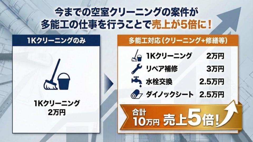 昨今の業界では、従来のハウスクリーニングの専門スキルに加えて、クロス補修や設備の交換など幅広い技術を兼ね備えた「多能工」の需要が急増しています。あらゆる状況に一人で対応できる技術力は、クライアントからの信頼を厚くし、次の受注へと直結します。