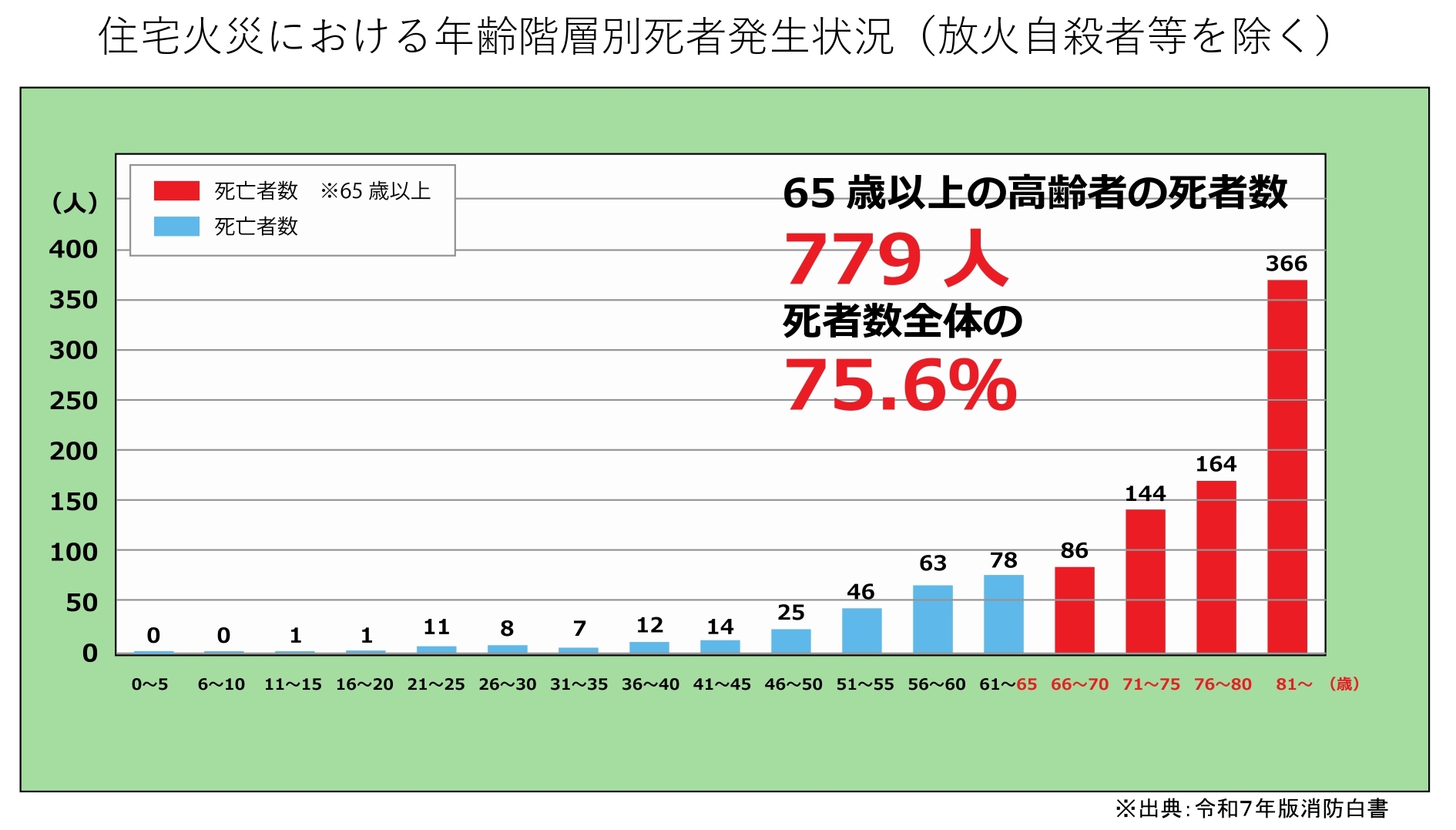 超高齢社会の進行に伴い、住宅火災による被害は高齢者に集中する傾向が強まっています。