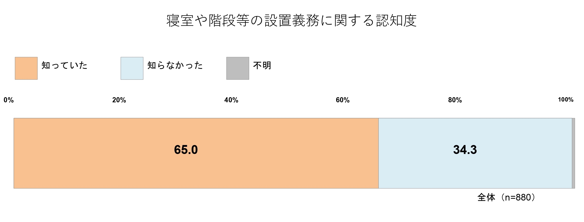 住警器について、寝室や階段等への設置義務を「知っていた」と答えた人は65.0%にのぼり、設置に関する認識は一定程度浸透していることが示された。一方で、「設置後10年を目安に交換する」という推奨については、71.1%が「知らなかった」と回答している。
