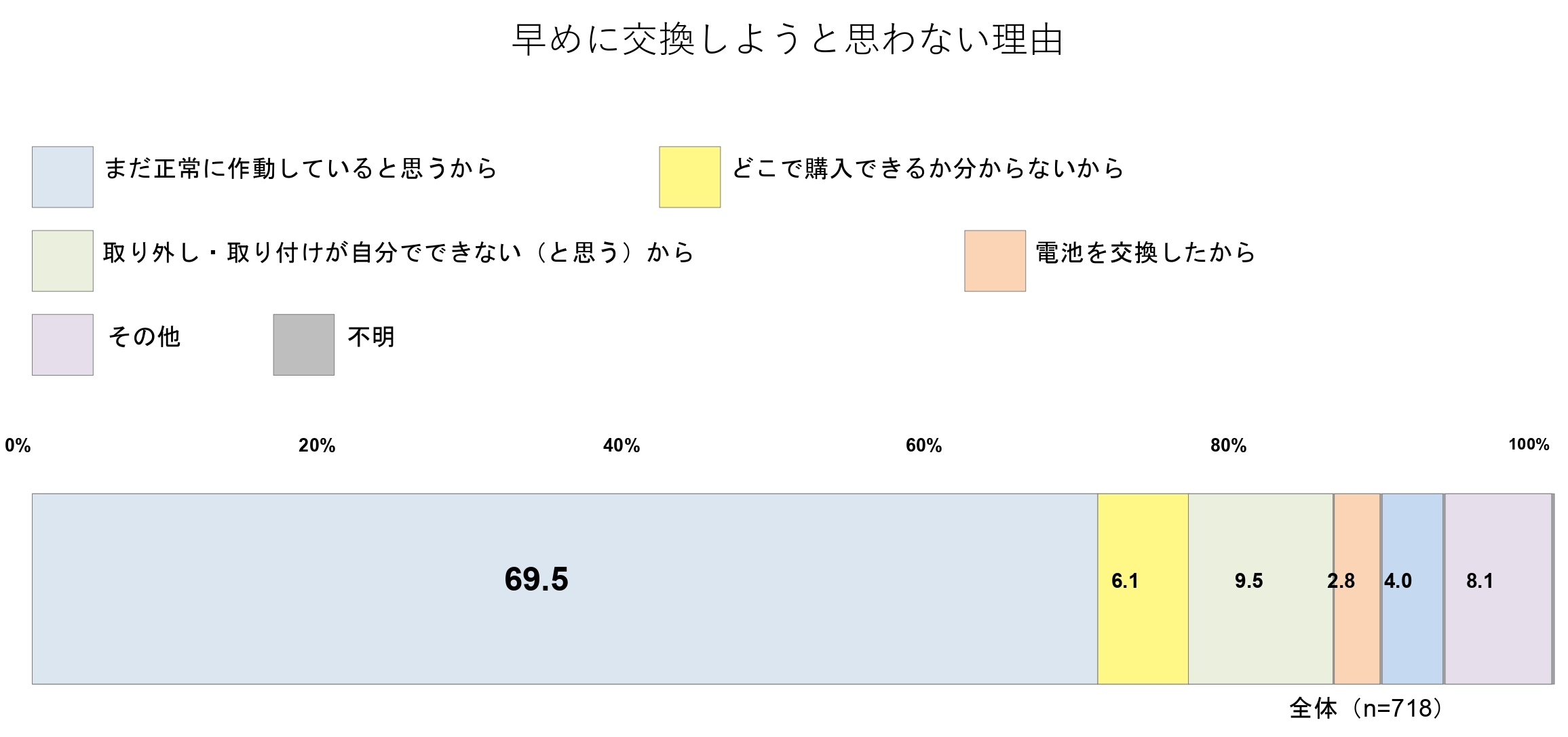 さらに、「そのうち交換しようと思う」「交換しようとは思わない」と回答した人(81.5%)を対象に、早めに交換しない理由を尋ねると「まだ正常に作動していると思うから」69.5%という結果に。約7割が点検を行わないまま、「動いているはず」「大丈夫だろう」という自己判断で交換を先送りしている実態がうかがえる。