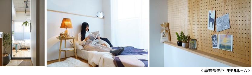 専有部住戸は、16.66㎡~37.36㎡の全17タイプとし、躯体現しの天井やカウンターキッチン、シャワーブースを備えたタイプなど、多彩なバリエーションを設けています。天然木の無垢床フローリングやラワン素材の有孔ボード、見せる収納等を採用し、快適性・効率性を追求しながらも、どこか温もりを感じさせる「自然体で自分らしさ溢れる住空間」を提供します。