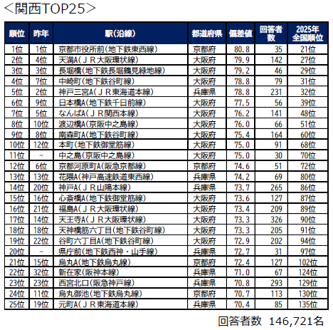 ●関西は、1位は2年連続で京都市役所前(京都府)で、唯一偏差値80台の極めて高い評価を得ています。2位は天満A(扇町・天満の近隣駅を統合)(大阪府)で、昨年4位から順位を上げました。3位は、2年連続で長堀橋(大阪府)です。トップ25の地域別では、大阪府が14駅、次いで兵庫県が7駅ランクインしています。